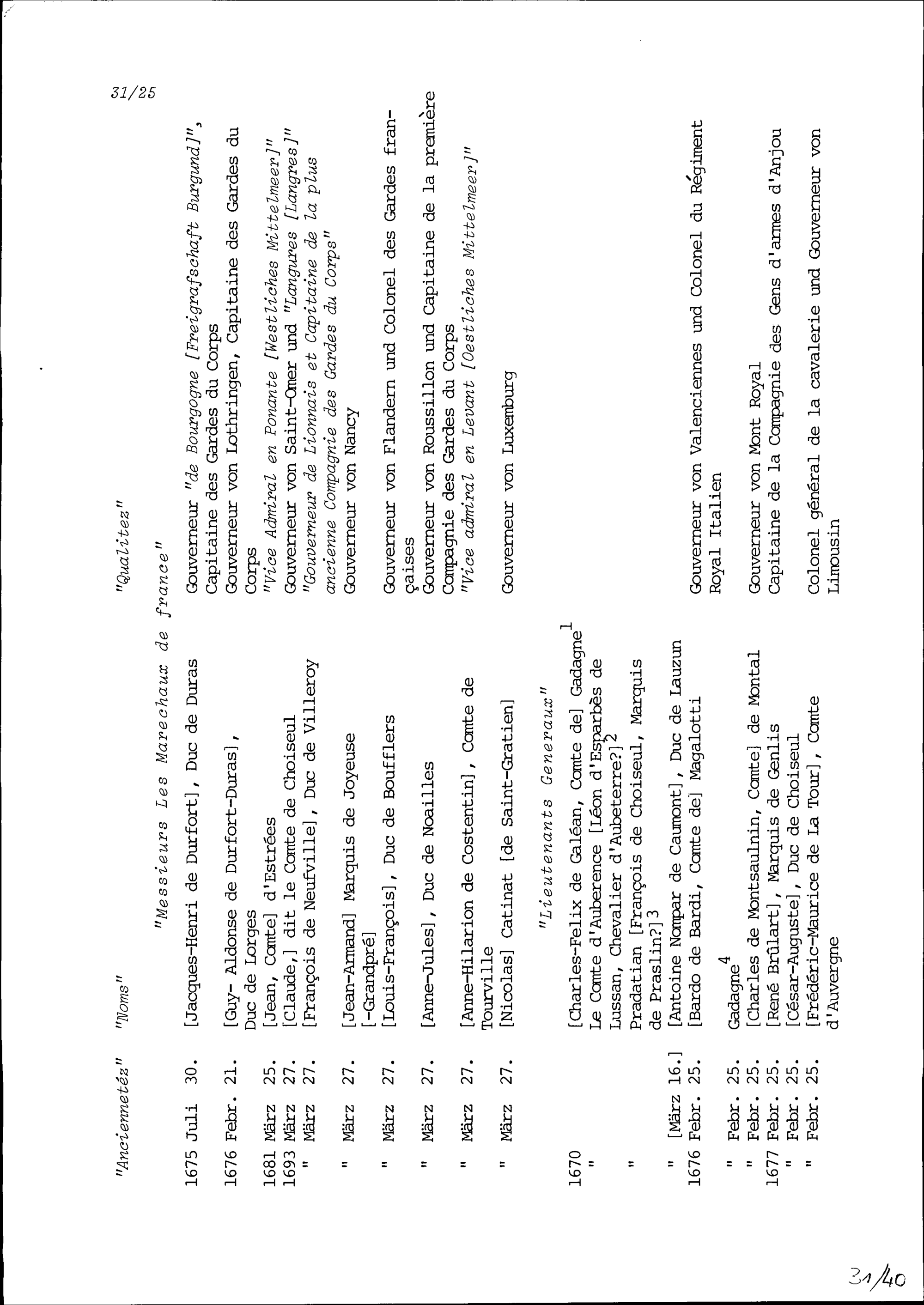 Offiziersliste der Jahre 1670 bis 1696