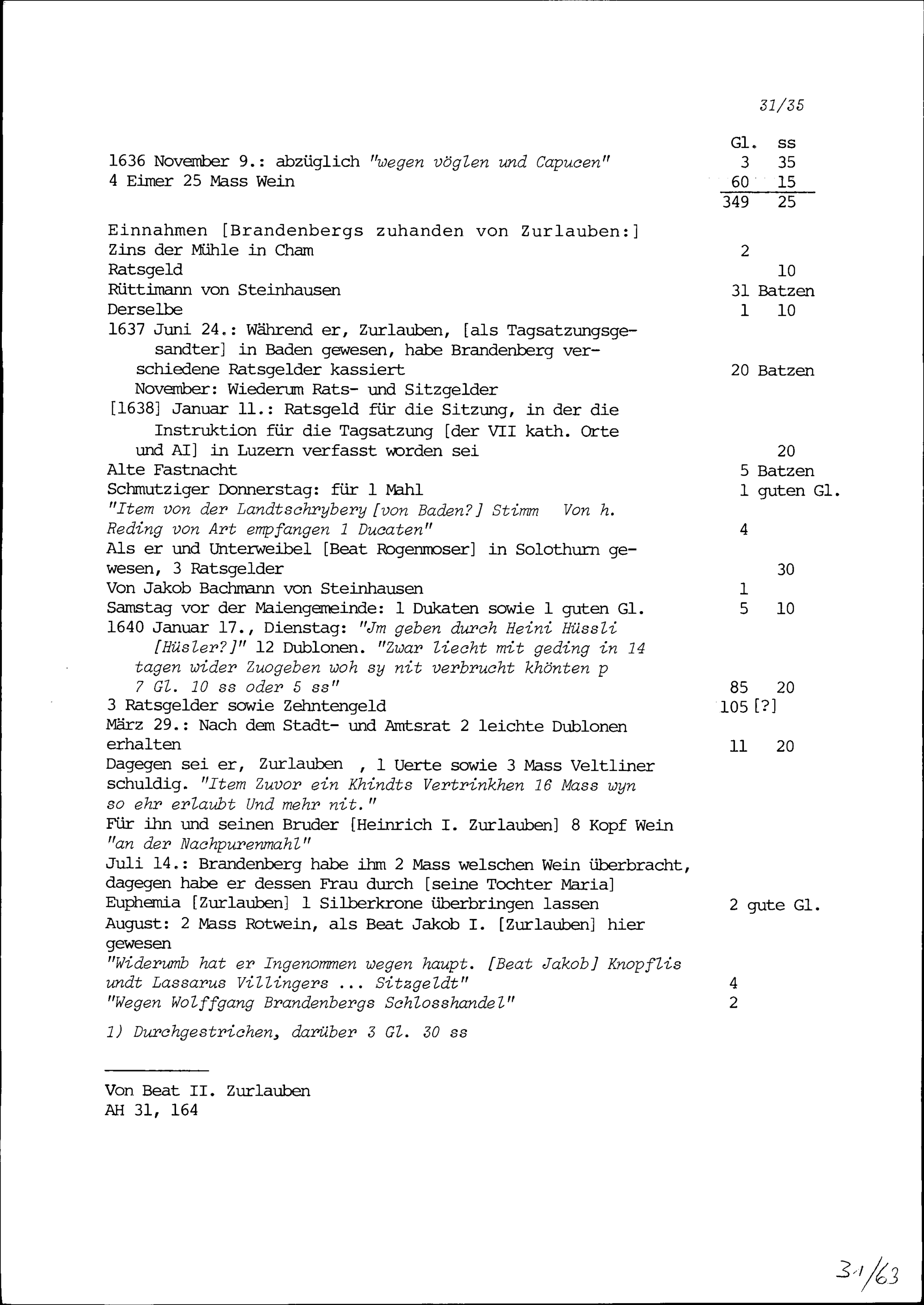 Ausgaben von Beat II. Zurlauben, Ammann, auf dem Rathaus in Zug, zusammengestellt von Christoph Brandenberg, Grossweibel, sowie weitere Rechnungsnotizen