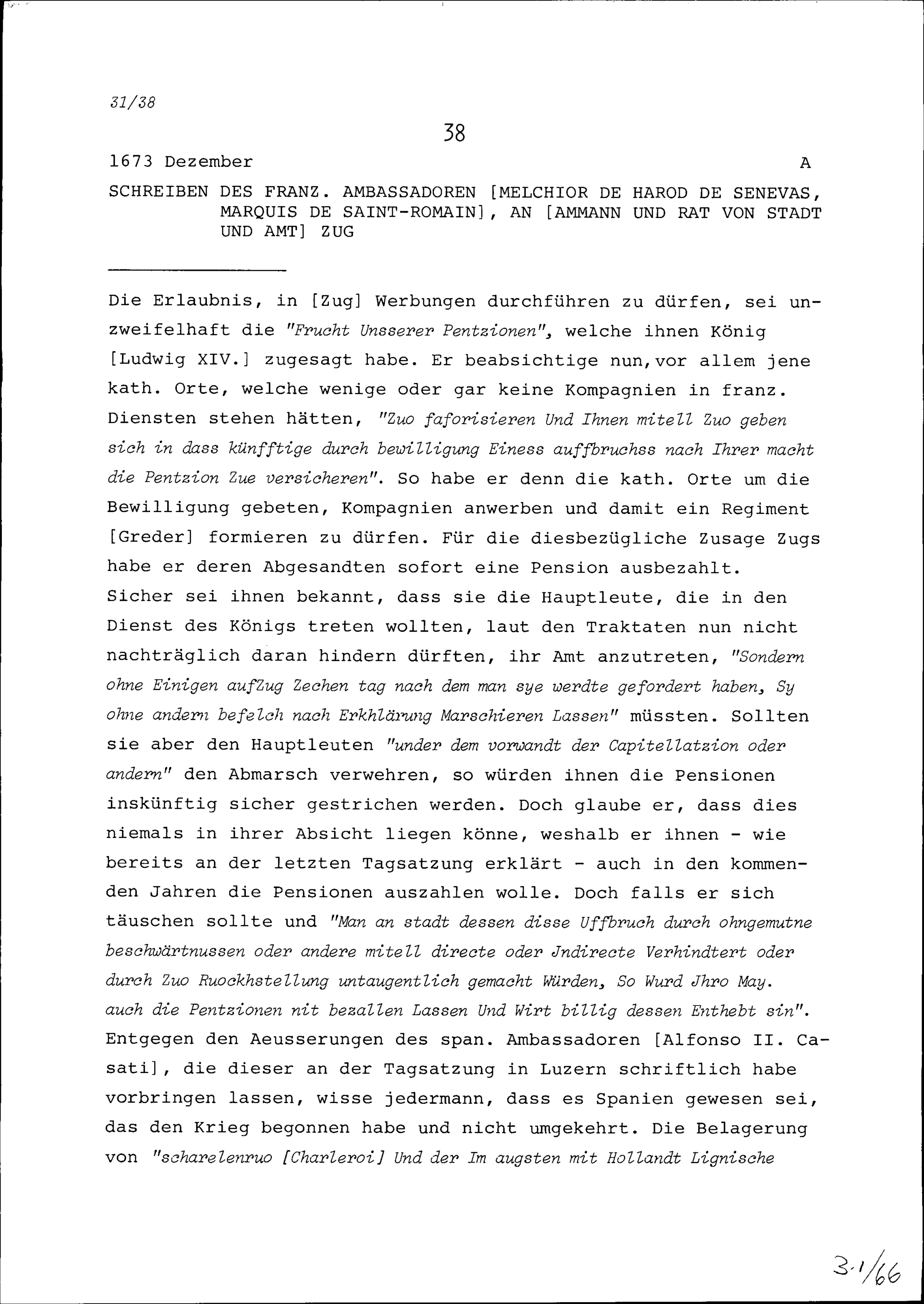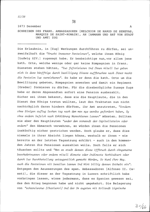 Schreiben von Melchior de Harod de Senevas, Marquis de Saint-Romain, Ambassador von Frankreich, an Ammann und Rat von Stadt und Amt Zug