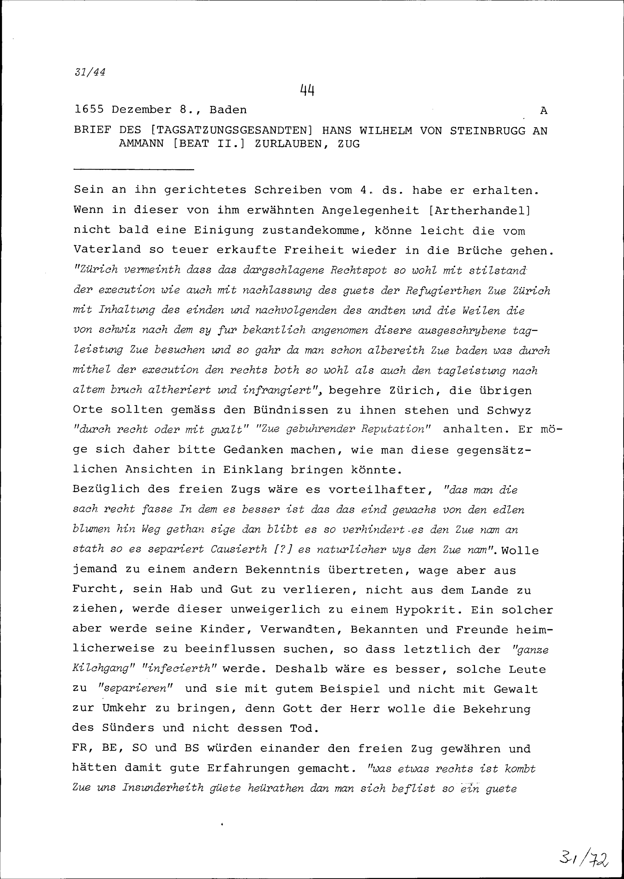 Schreiben von Hans Wilhelm von Steinbrugg, Tagsatzungsgesandter, an Beat II. Zurlauben, Ammann, Zug