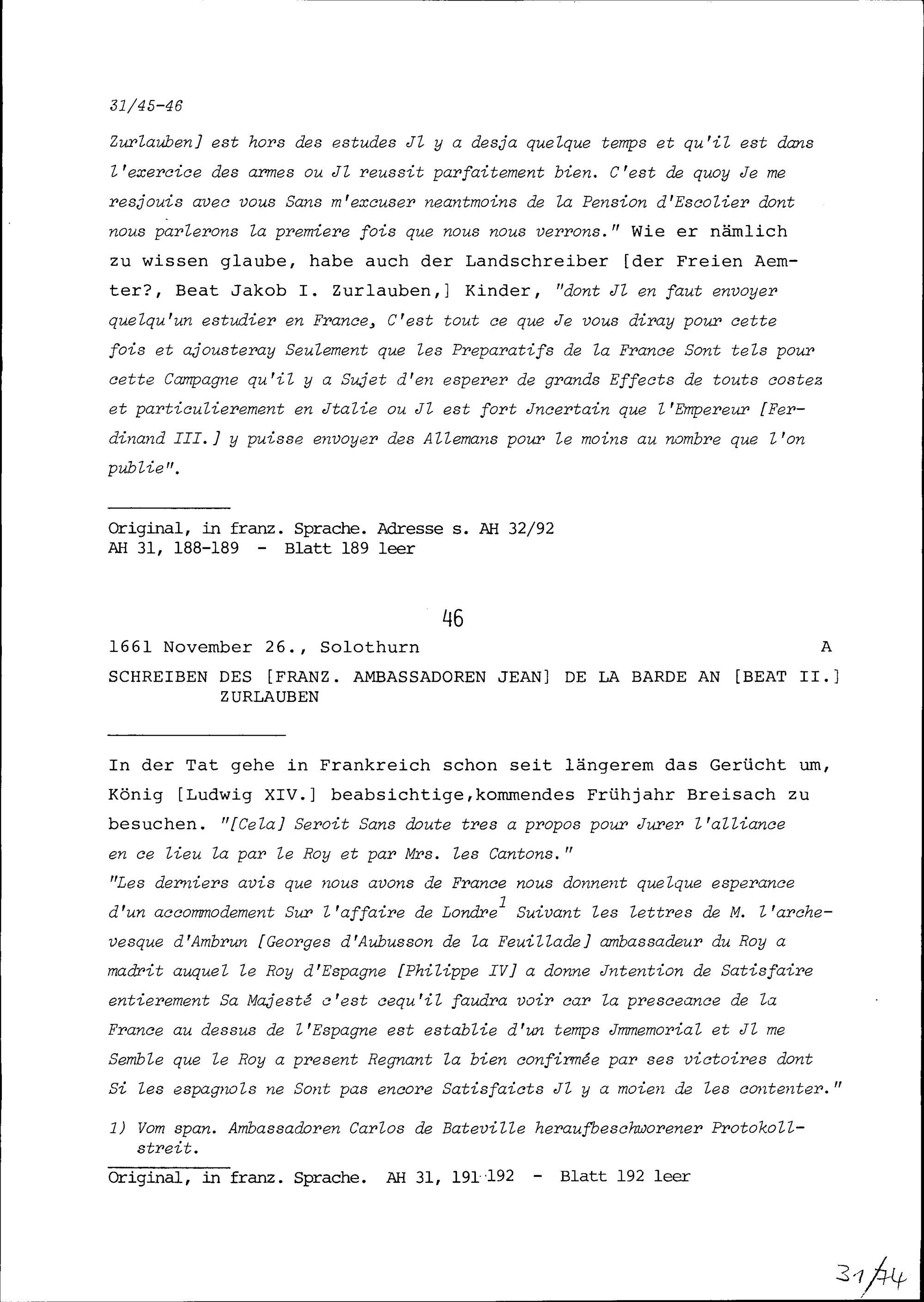 Schreiben von Jean de la Barde, Ambassador von Frankreich, an Beat II. Zurlauben
