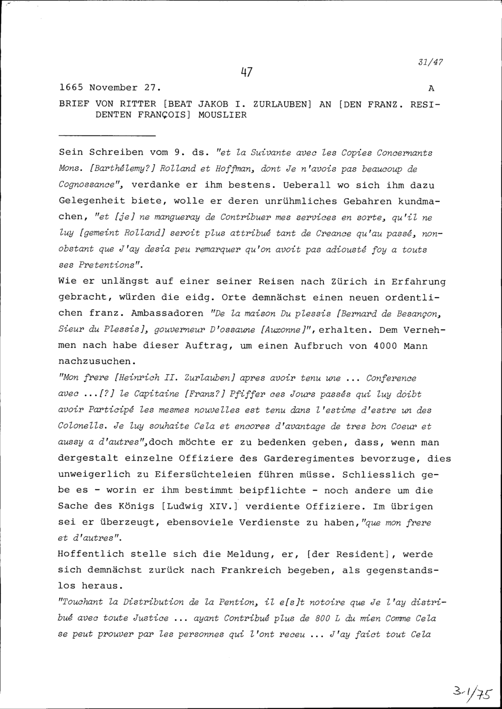 Schreiben von Beat Jakob I. Zurlauben an François Mouslier, Resident von Frankreich