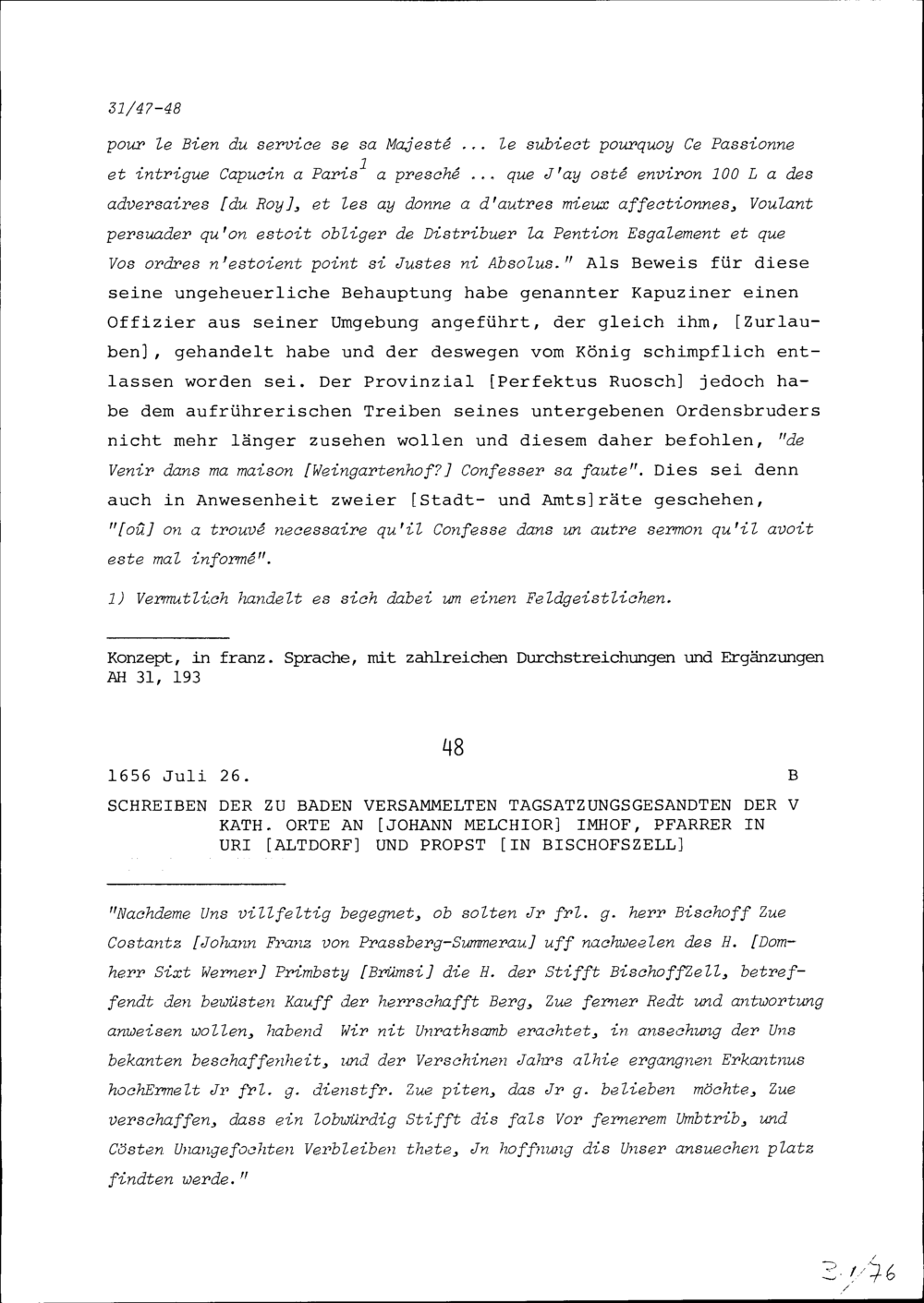 Schreiben der Tagsatzungsgesandten der Fünf Katholischen Orte in Baden an Johann Melchior Imhof, Pfarrer in Altdorf und Propst in Bischofszell