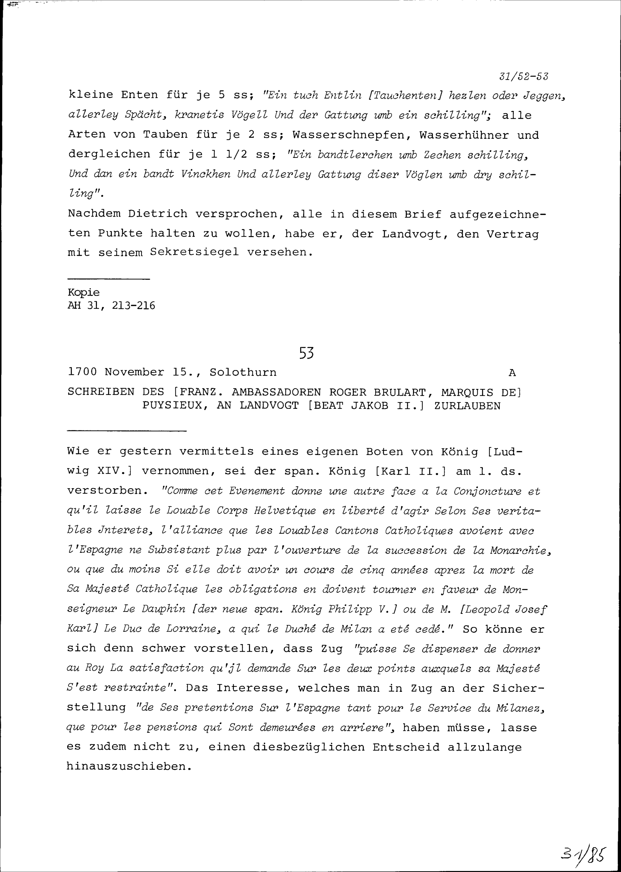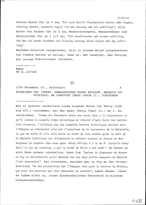 Schreiben von Roger Brûlart, Marquis de Puysieux, Ambassador von Frankreich, an Beat...