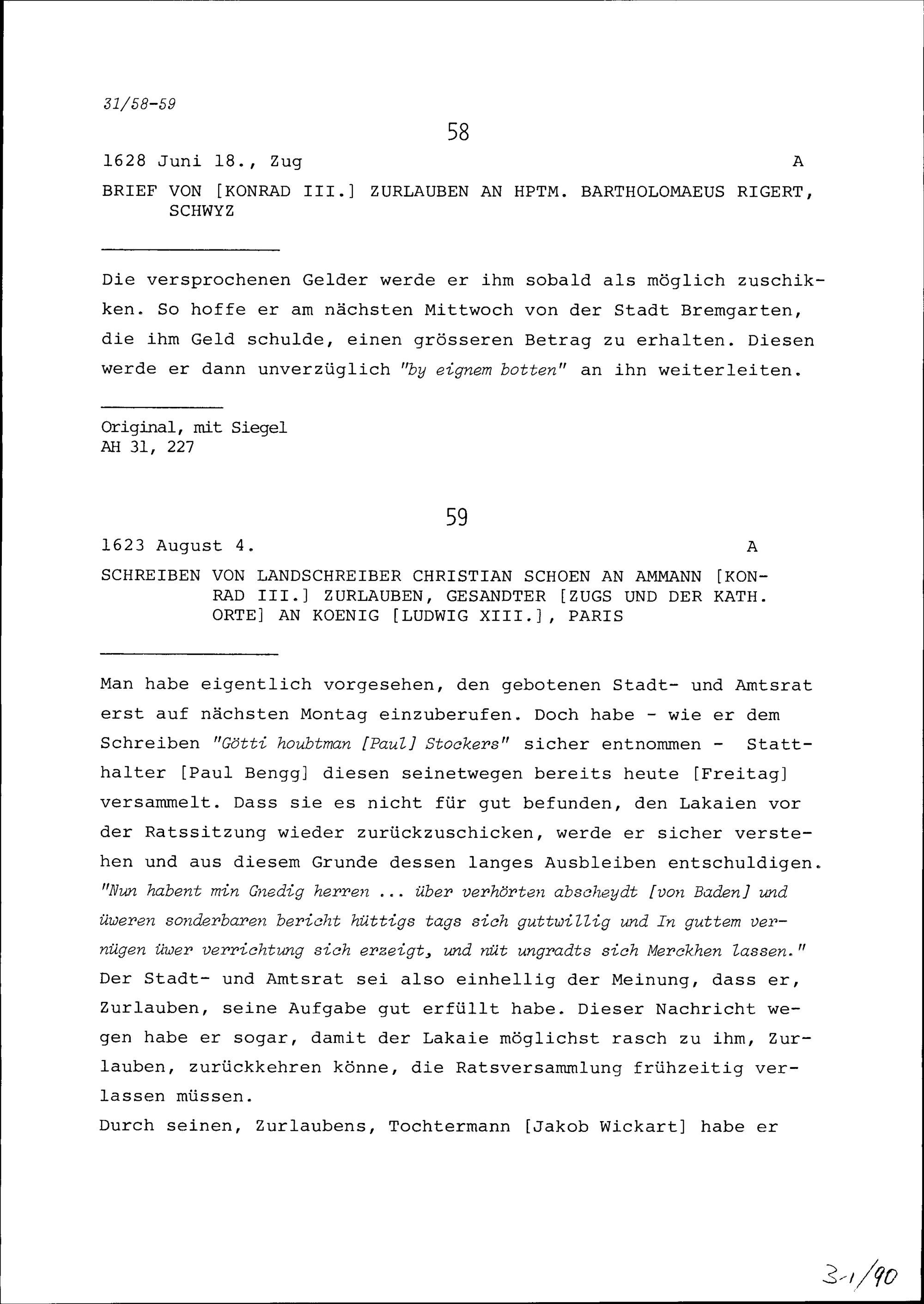 Schreiben von Konrad III. Zurlauben an Bartholomäus Rigert, Hauptmann, Schwyz