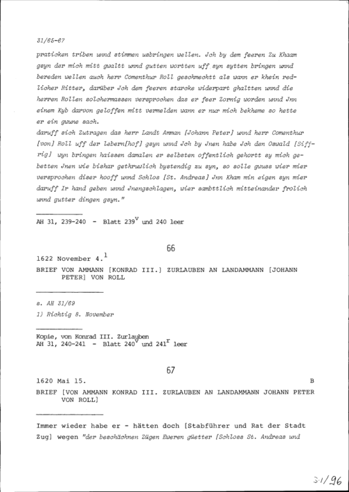 Schreiben von Konrad III. Zurlauben, Ammann, an Johann Peter von Roll, Landamman...