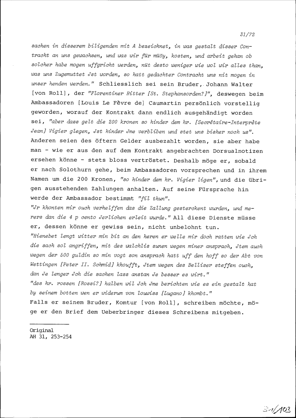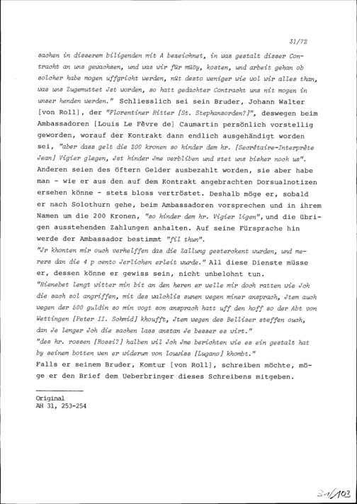 Schreiben von Johann Peter von Roll an Konrad III. Zurlauben, Statthalter