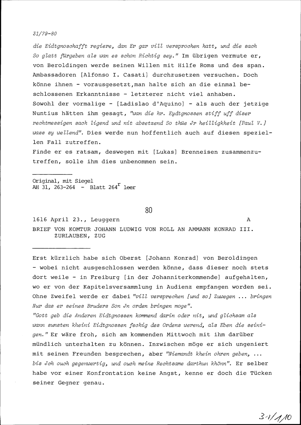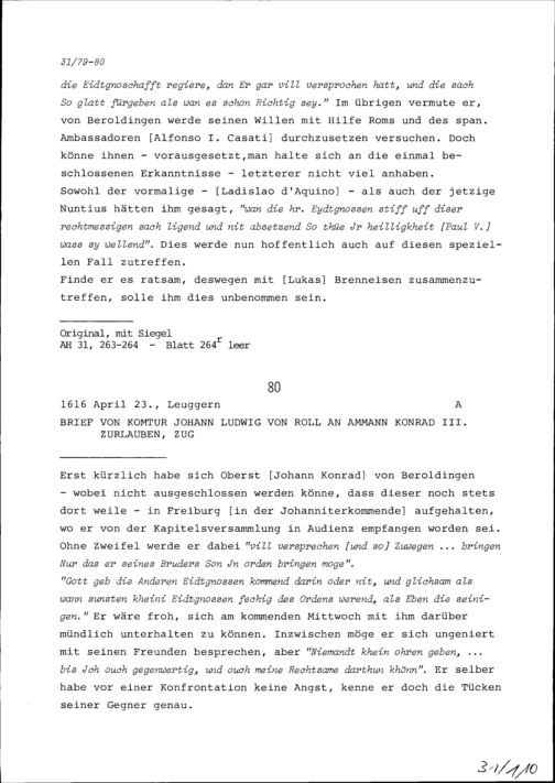 Schreiben von Johann Ludwig von Roll, Komtur, an Konrad III. Zurlauben, Ammann, Zug