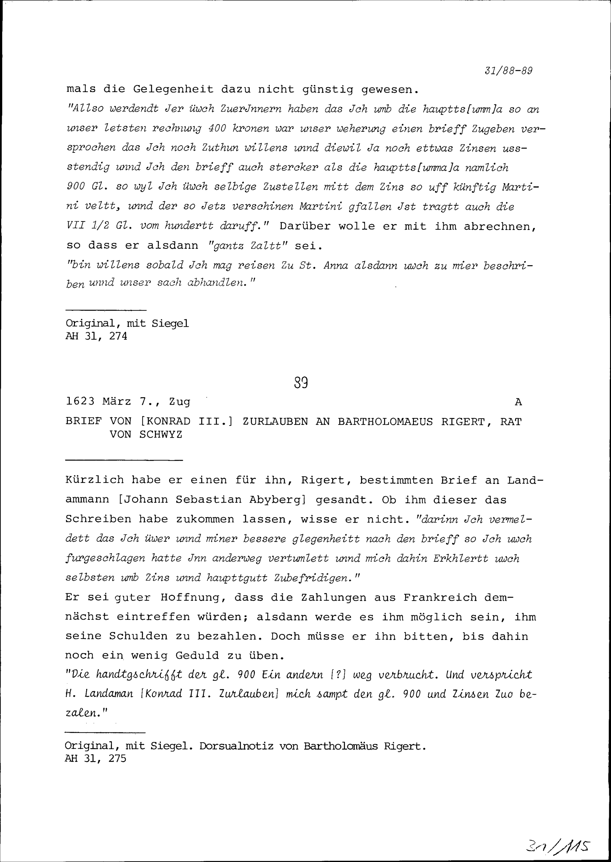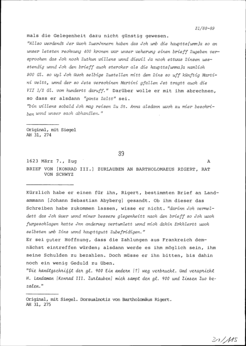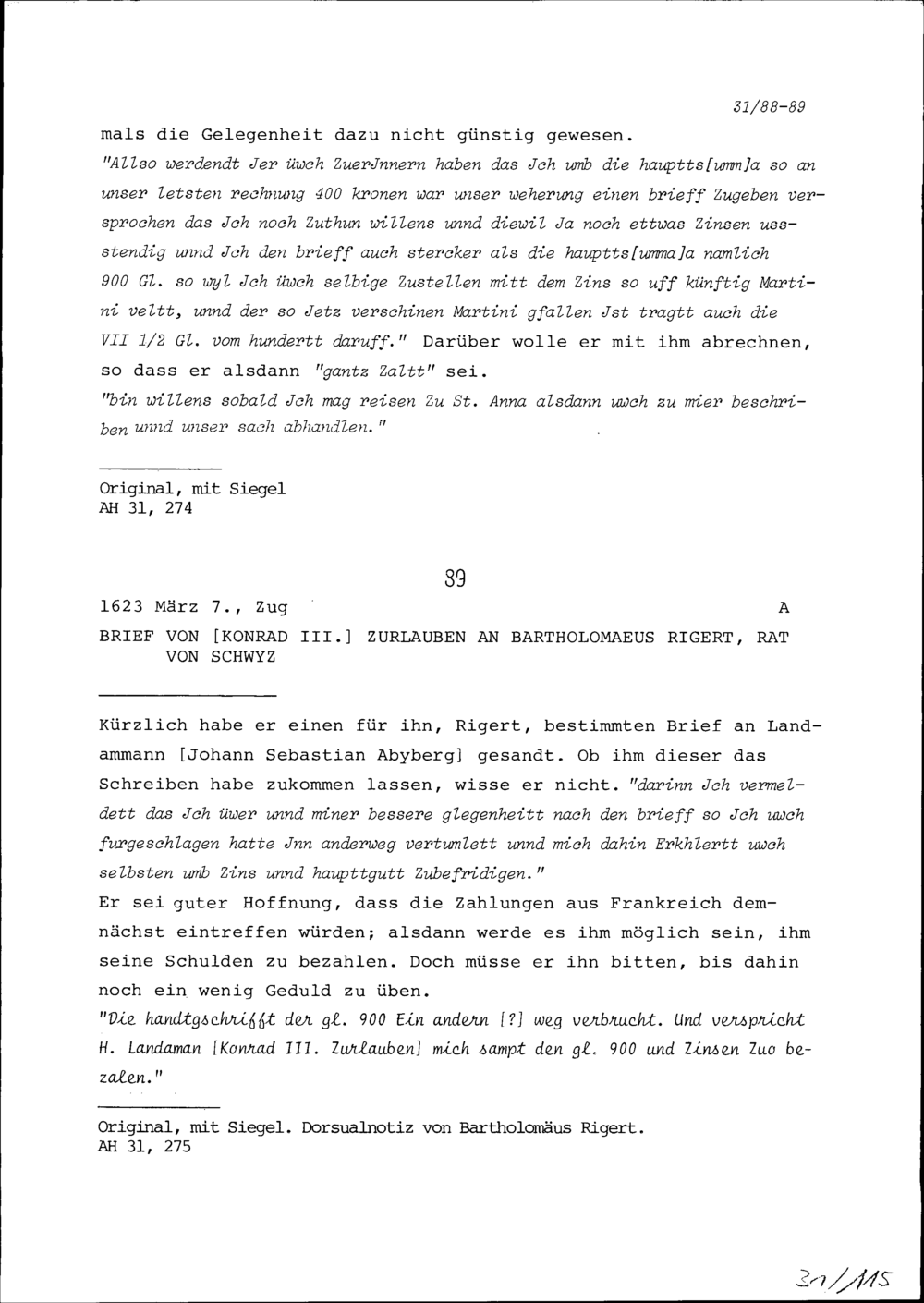 Schreiben von Konrad III. Zurlauben an Bartholomäus Rigert, Rat von Schwyz