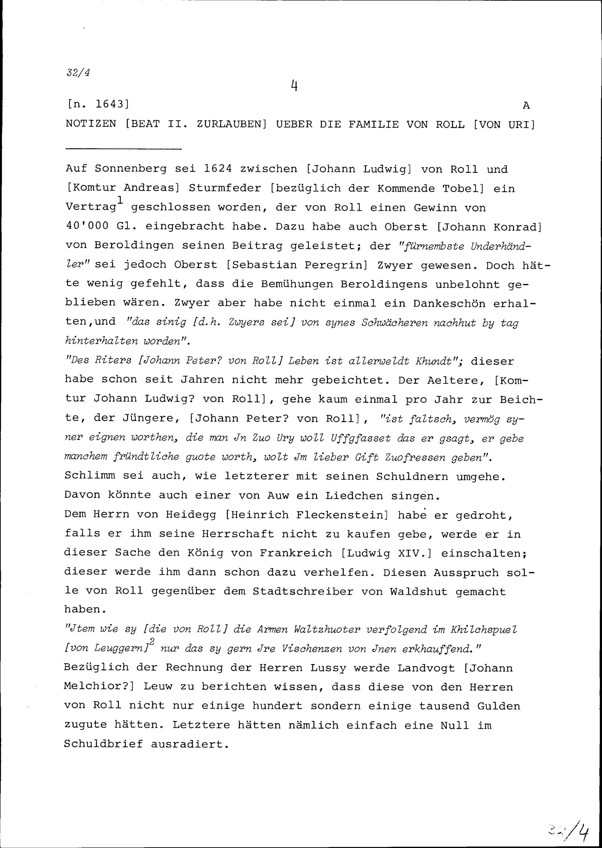 Notiz von Beat II. Zurlauben über die Familie von Roll von Uri