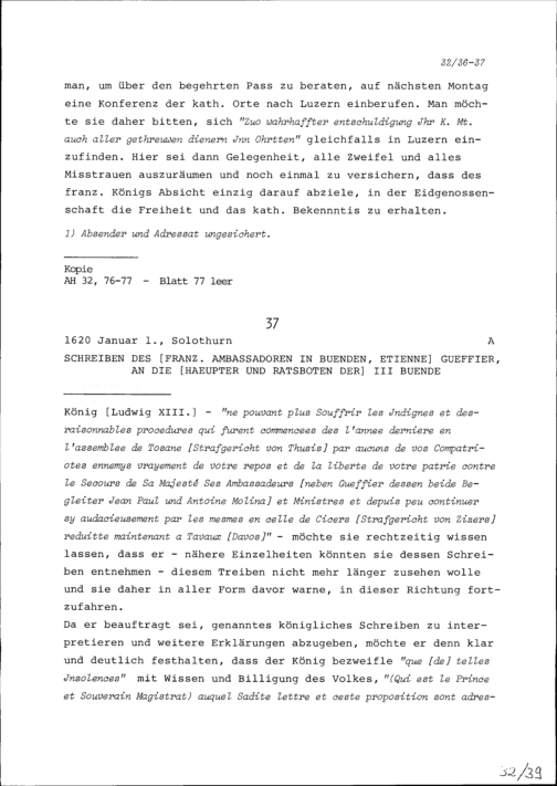 Schreiben von Etienne Gueffier, Ambassador von Frankreich in Bünden, an die Häupter und Ratsboten der Drei Bünde