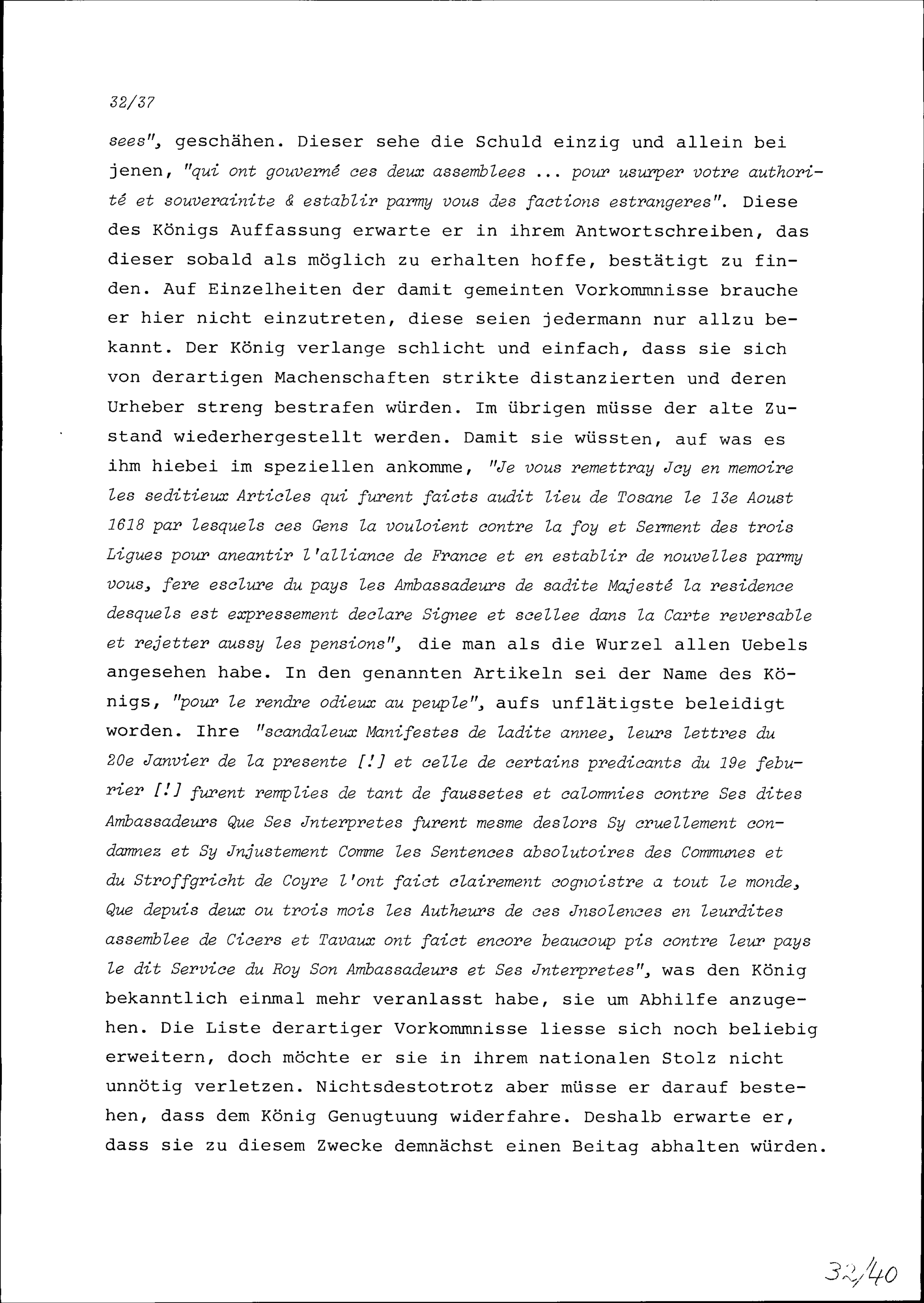 Schreiben von Etienne Gueffier, Ambassador von Frankreich in Bünden, an die Häupter und Ratsboten der Drei Bünde