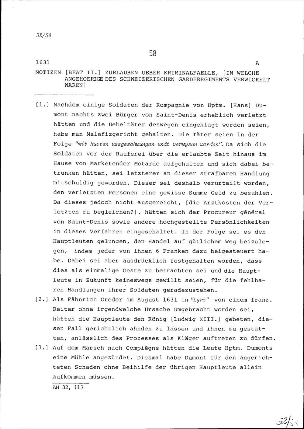 Notiz von Beat II. Zurlauben über Kriminalfälle, in welche Angehörige des Schweizerischen Garderegiments verwickelt waren