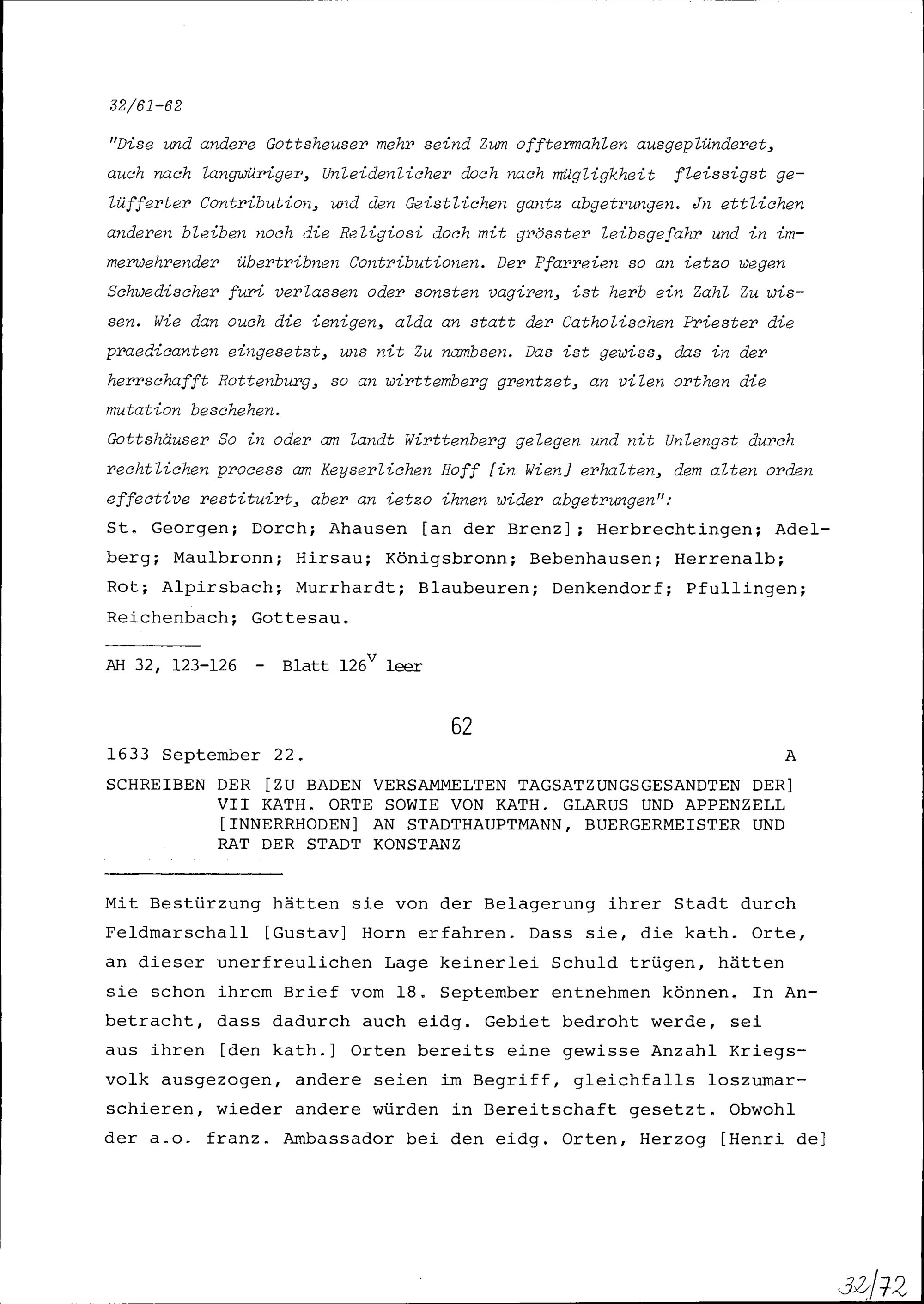 Schreiben der Tagsatzungsgesandten der Sieben Katholischen Orte sowie von Katholisch Glarus und Appenzell-Innerrhoden in Baden an Stadthauptmann, Bürgermeister und Rat der Stadt Konstanz
