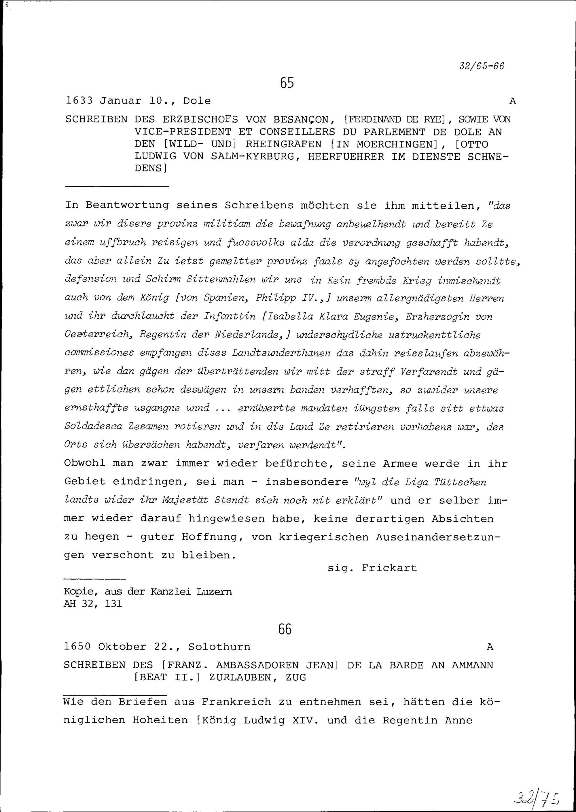 Schreiben von Ferdinand de Rye, Erzbischof von Besançon, sowie von Vizepräsident und Mitglied des Parlaments von Dole an Otto Ludwig von Salm-Kyrburg, Wild- und Rheingrafen in Mörchingen und Heerführer im Dienste Schwedens