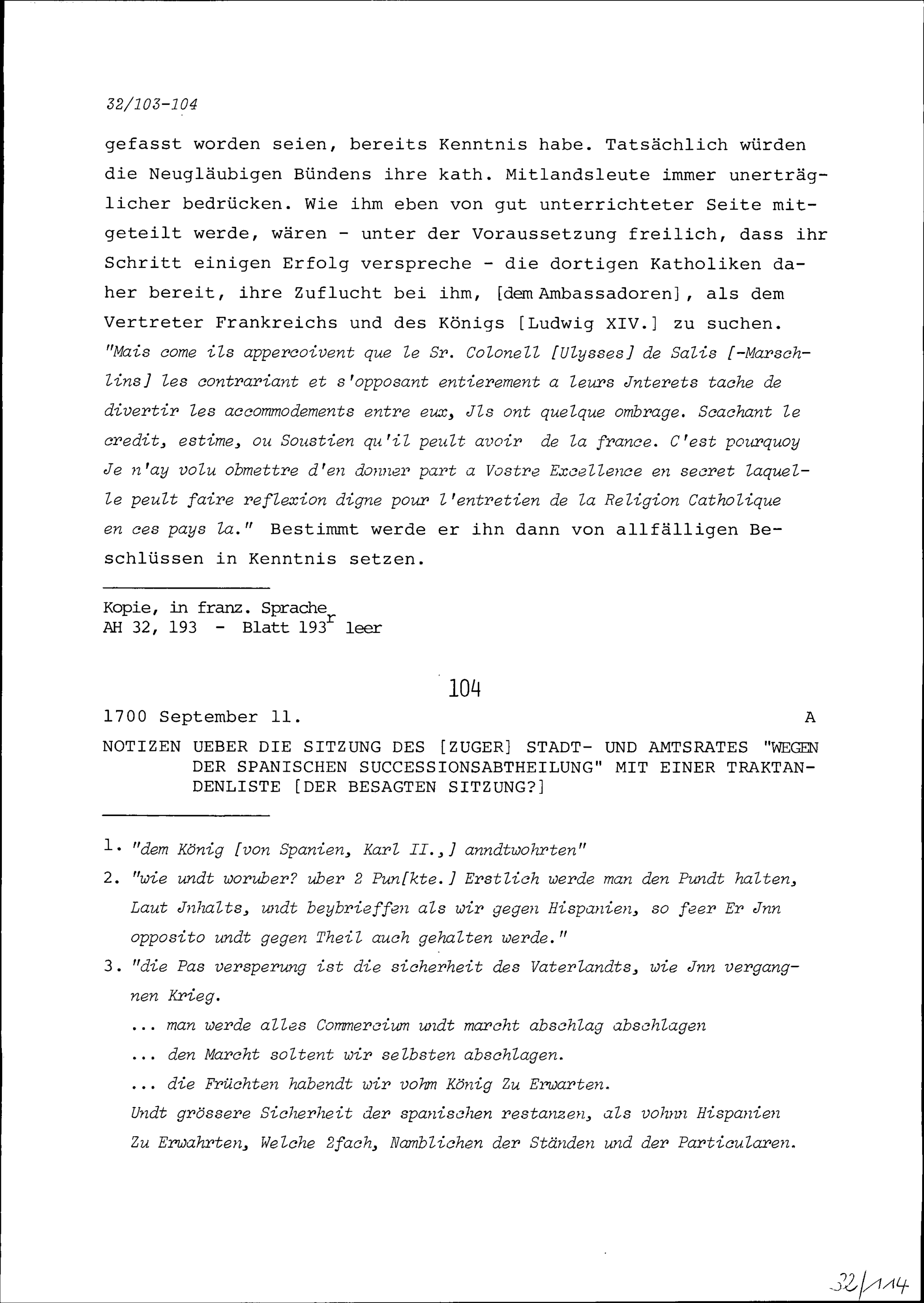 Traktandenliste und Notiz über die Sitzung des Stadt- und Amtrats Zug betreffend spanische Successionsabteilung