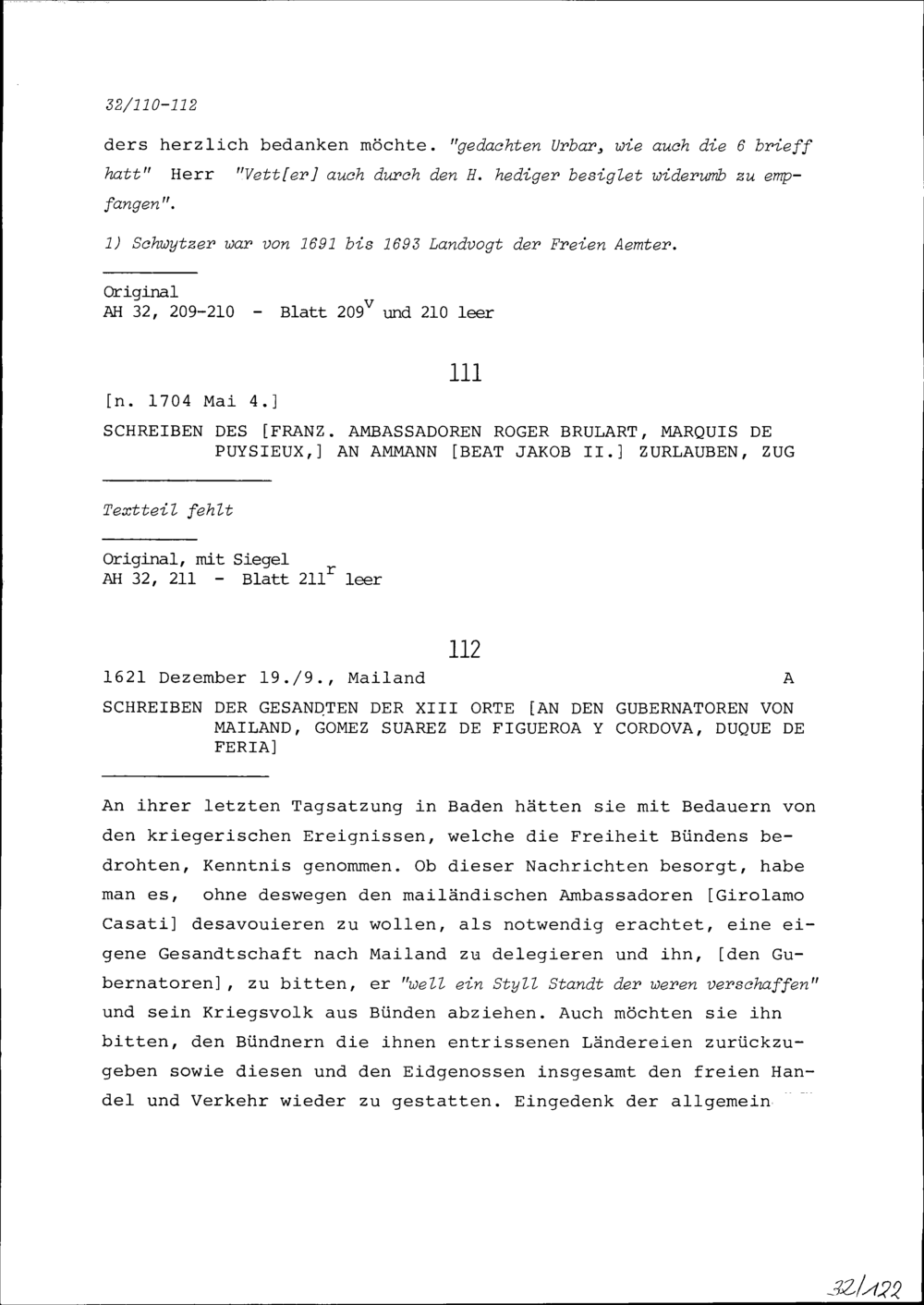 Schreiben von Roger Brûlart, Marquis de Puysieux, Ambassador von Frankreich, an Beat...
