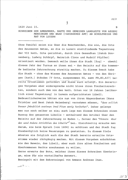 Schreiben der Ammänner, Räte und Gemeinen Landleute der Drei Gemeinden des Äusseren Amts (Ägeri, Menzingen und Baar) an Schultheiss und Rat Luzern