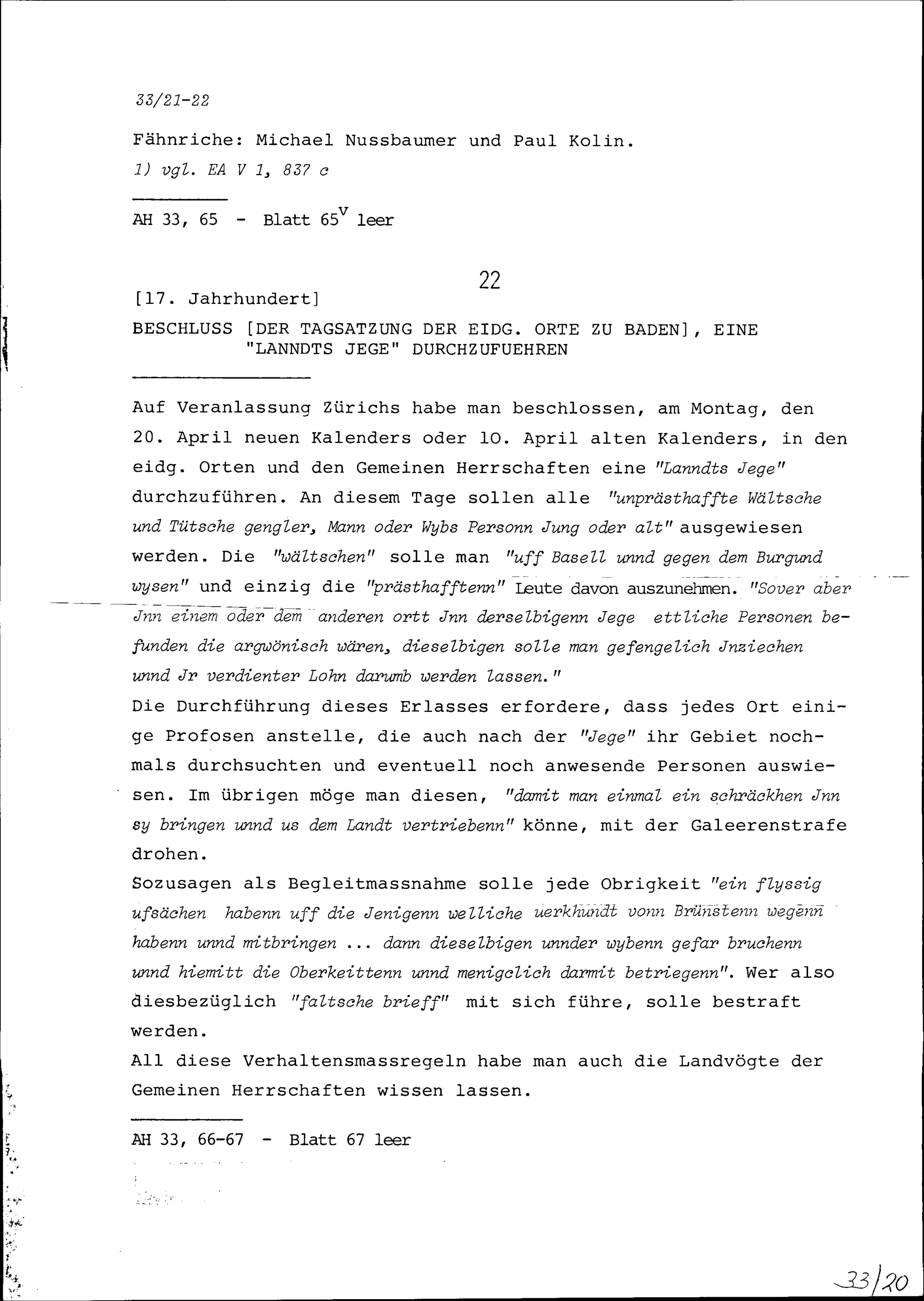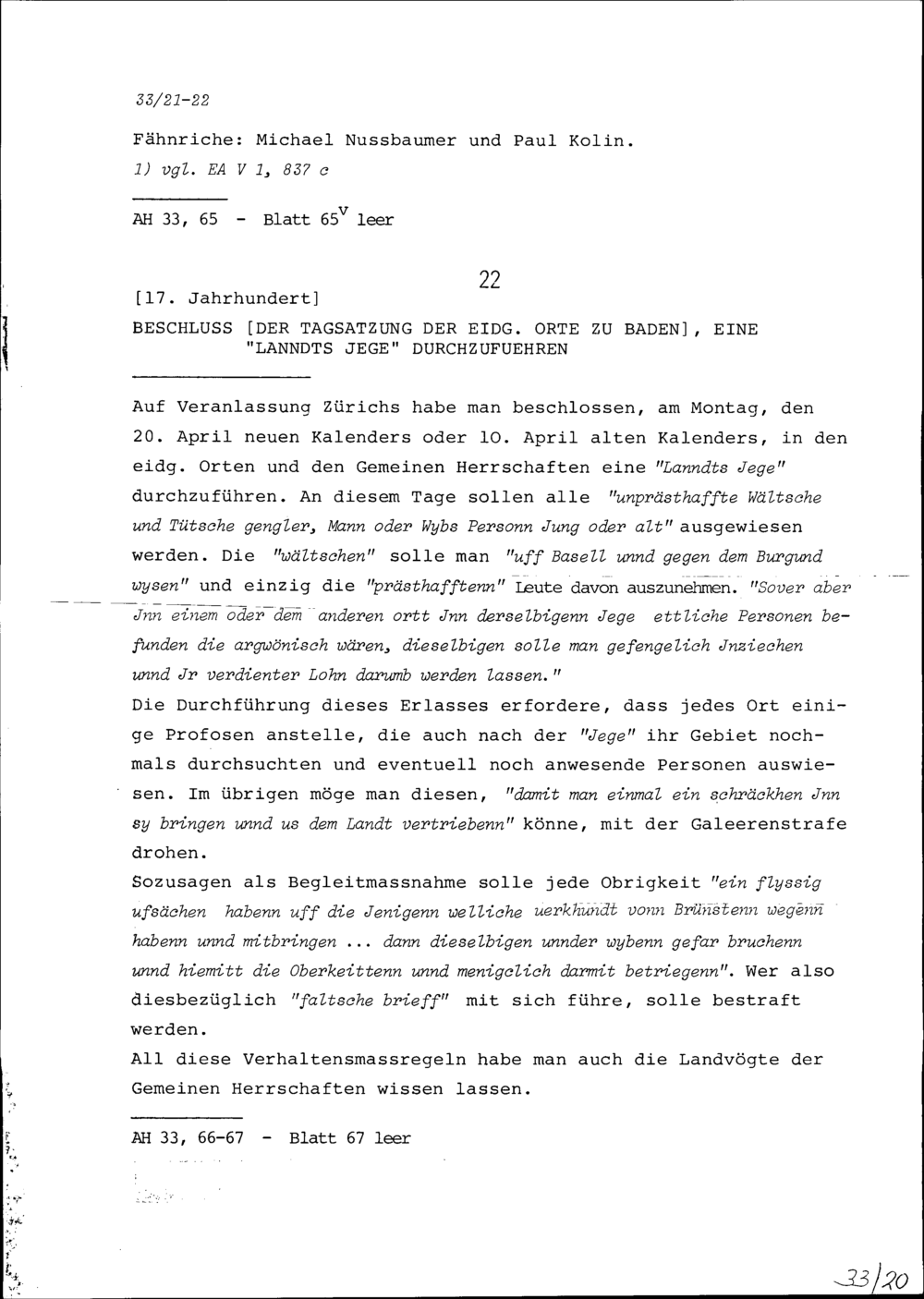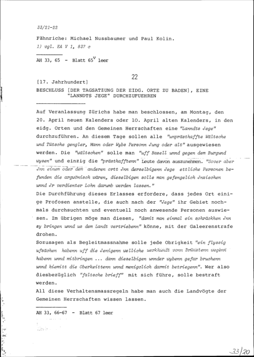Beschluss der Tagsatzung der Eidgenössischen Orte in Baden, eine landesweite Jagd nach Fremden durchzuführen