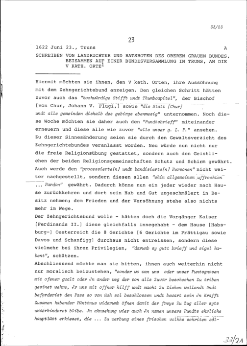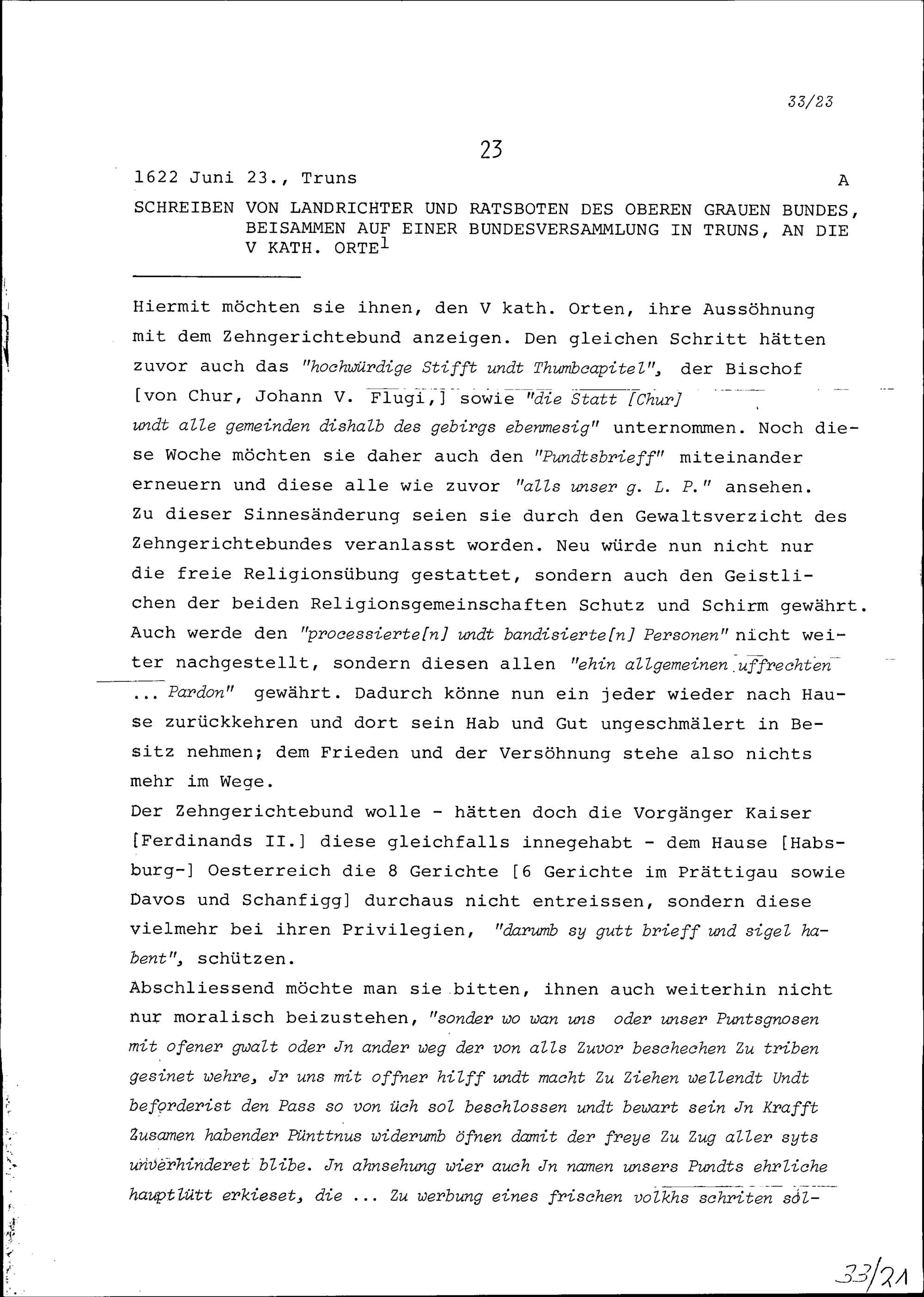 Schreiben der Landrichter und Ratsboten des Oberen Grauen Bundes auf einer Bundesversammlung in Truns an die Fünf Katholischen Orte