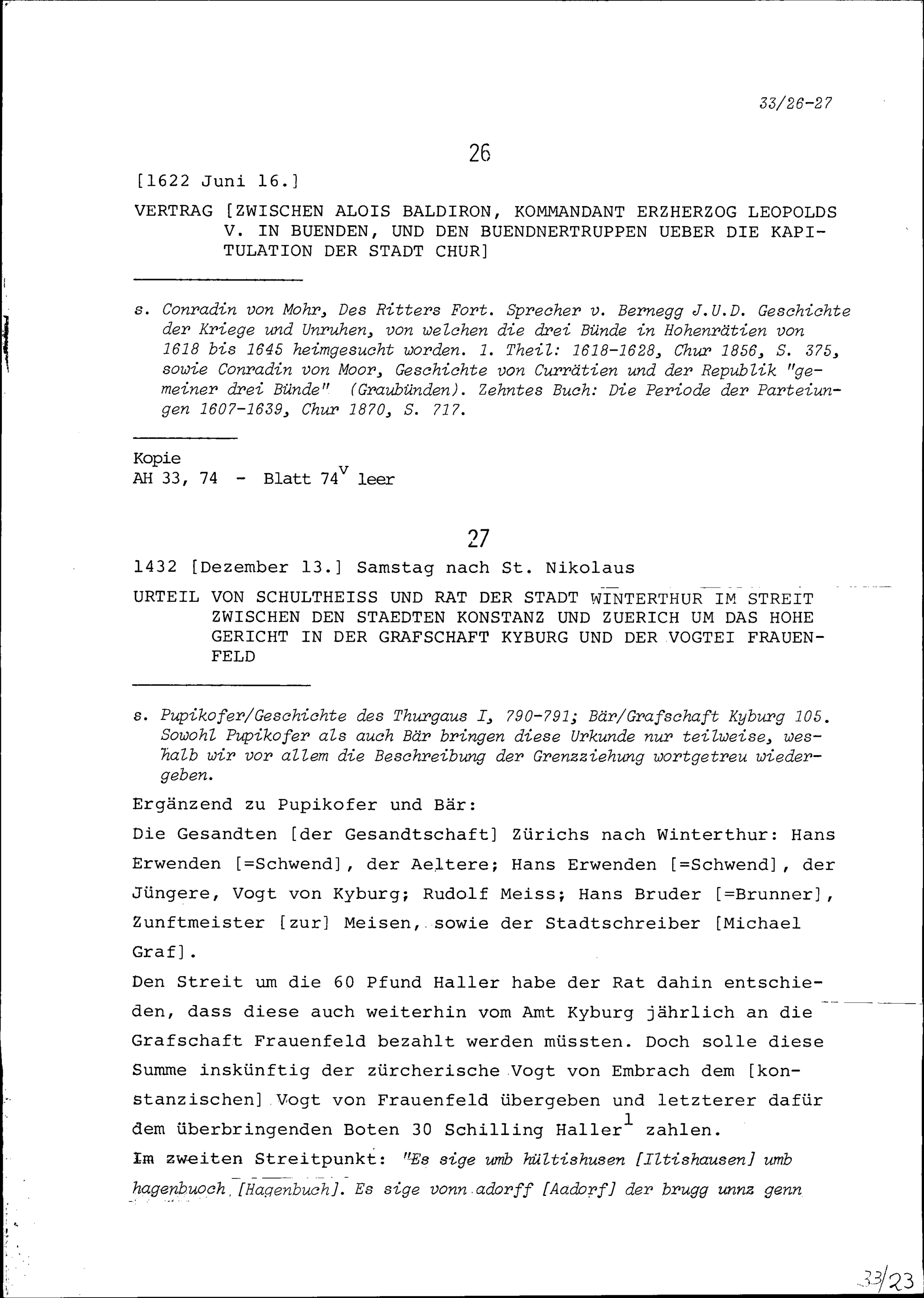Vertrag zwischen Alois Baldiron, Kommandant von Leopolds V., Erzherzog, in Bünden, und den Bündner Truppen über die Kapitulation der Stadt Chur