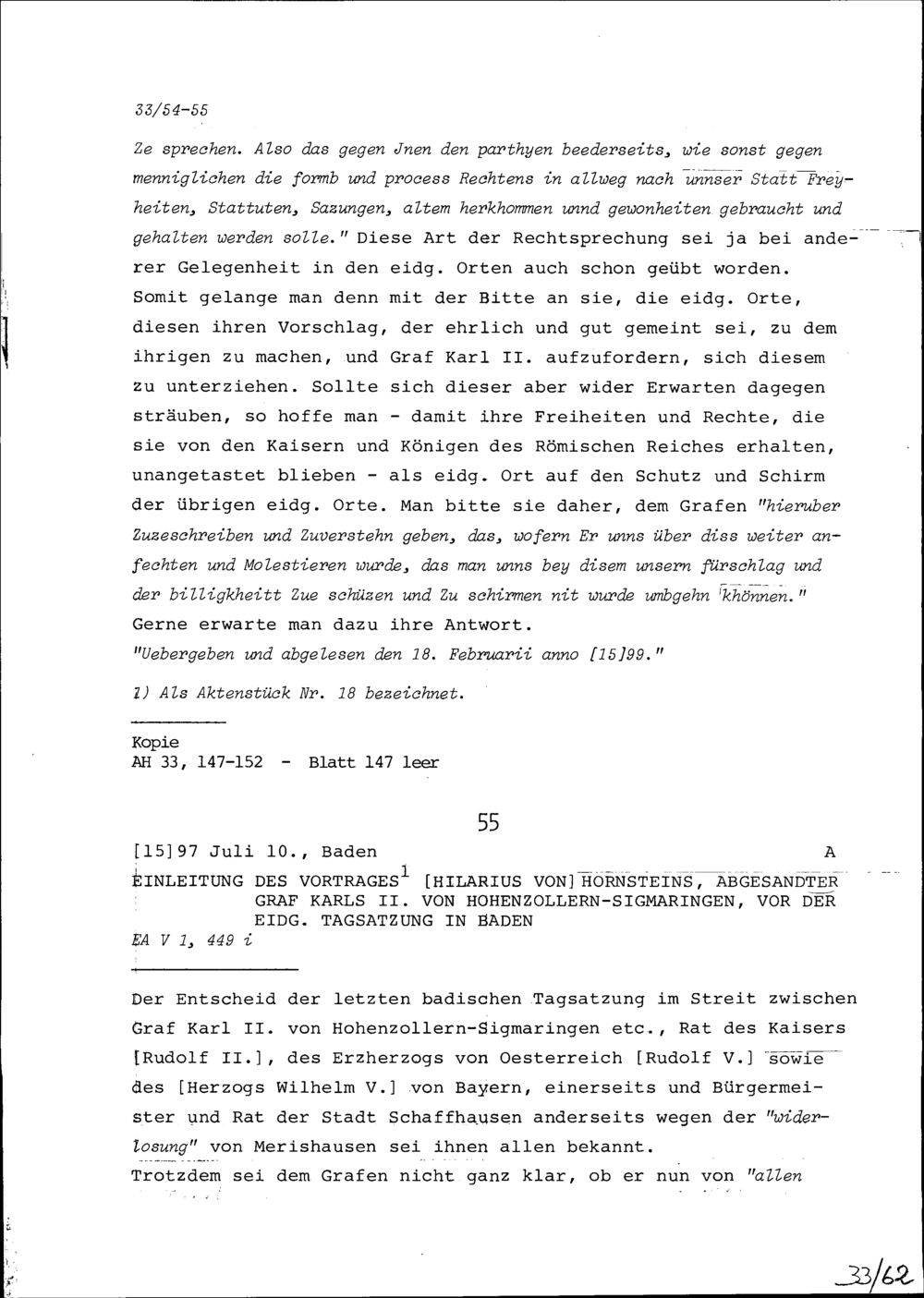 Einleitung des Vortrag von Hilarius von Hornstein, Abgesandter von Karl II., Graf von Hohenzollern-Sigmaringen, vor der Eidgenössischen Tagsatzung in Baden