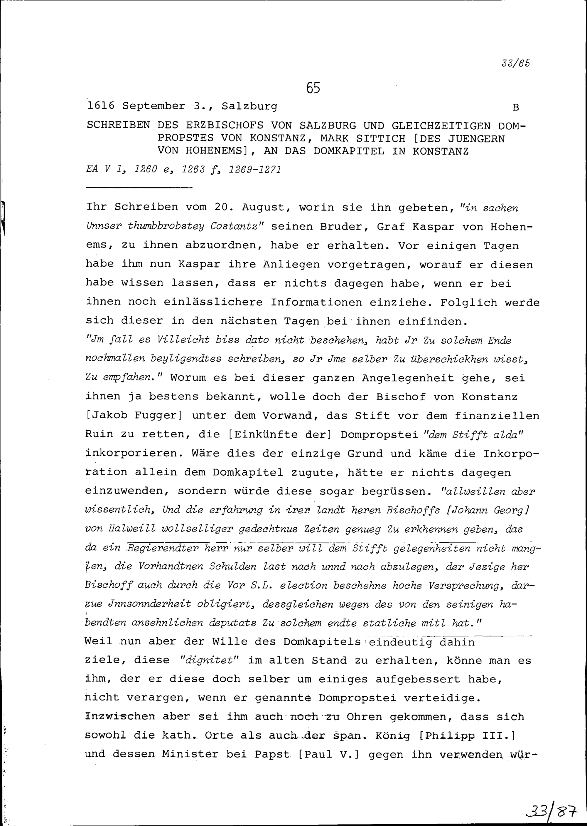 Schreiben von Mark Sittich, der Jüngere, von Hohenems, Erzbischofs von Salzburg und Dompropsts von Konstanz, an das Domkapitel in Konstanz