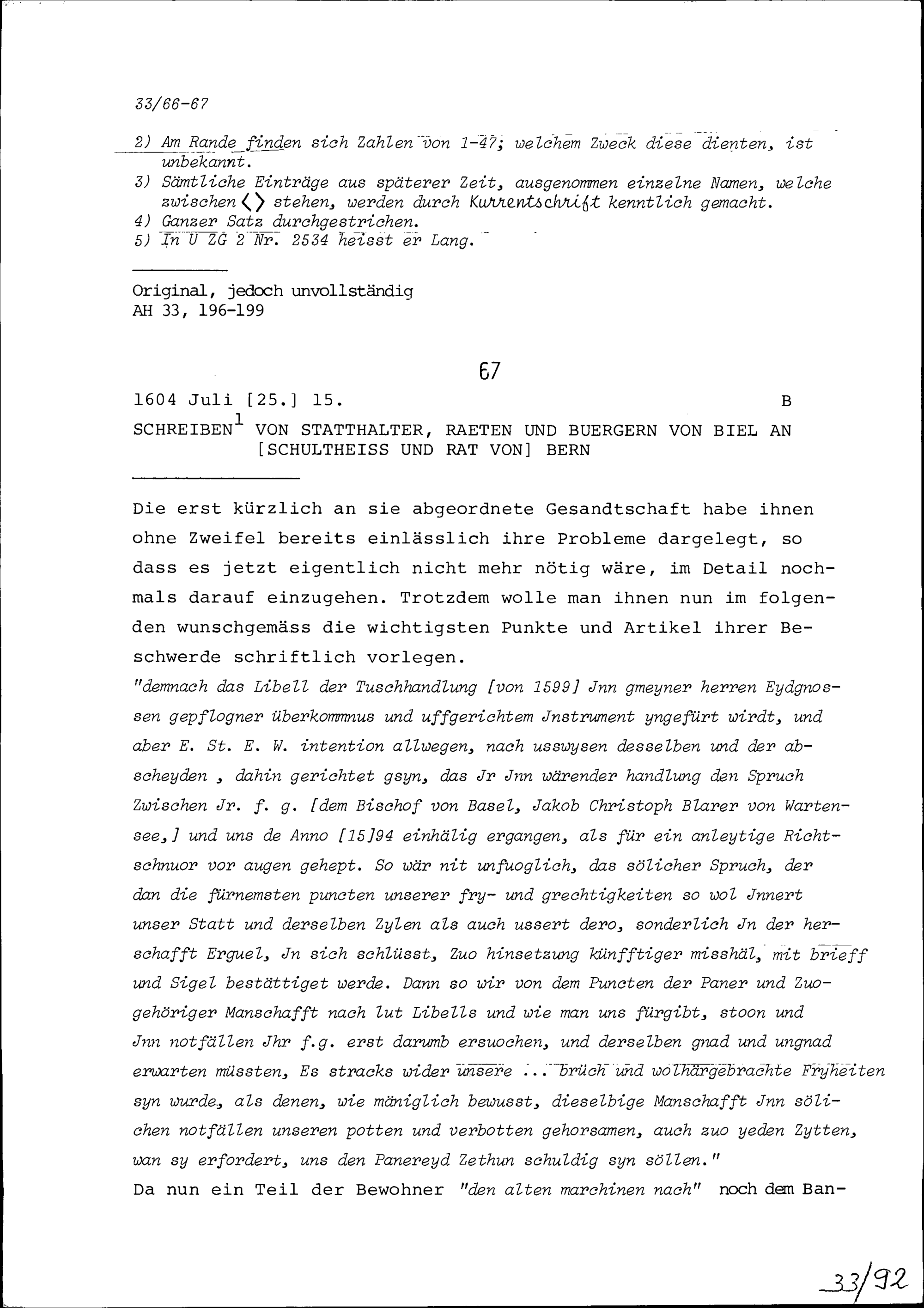 Schreiben des Statthalters, der Räte und Bürger von Biel an Schultheiss und Rat Bern