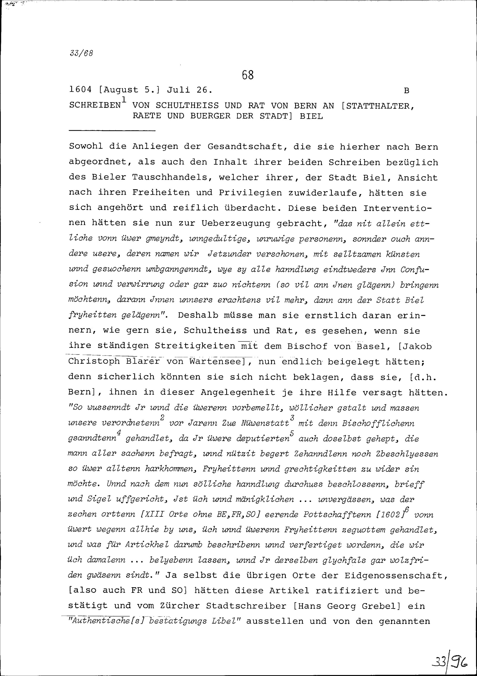 Schreiben des Schultheiss und Rats Bern an Statthalter, Räte und Bürger der Stadt Biel
