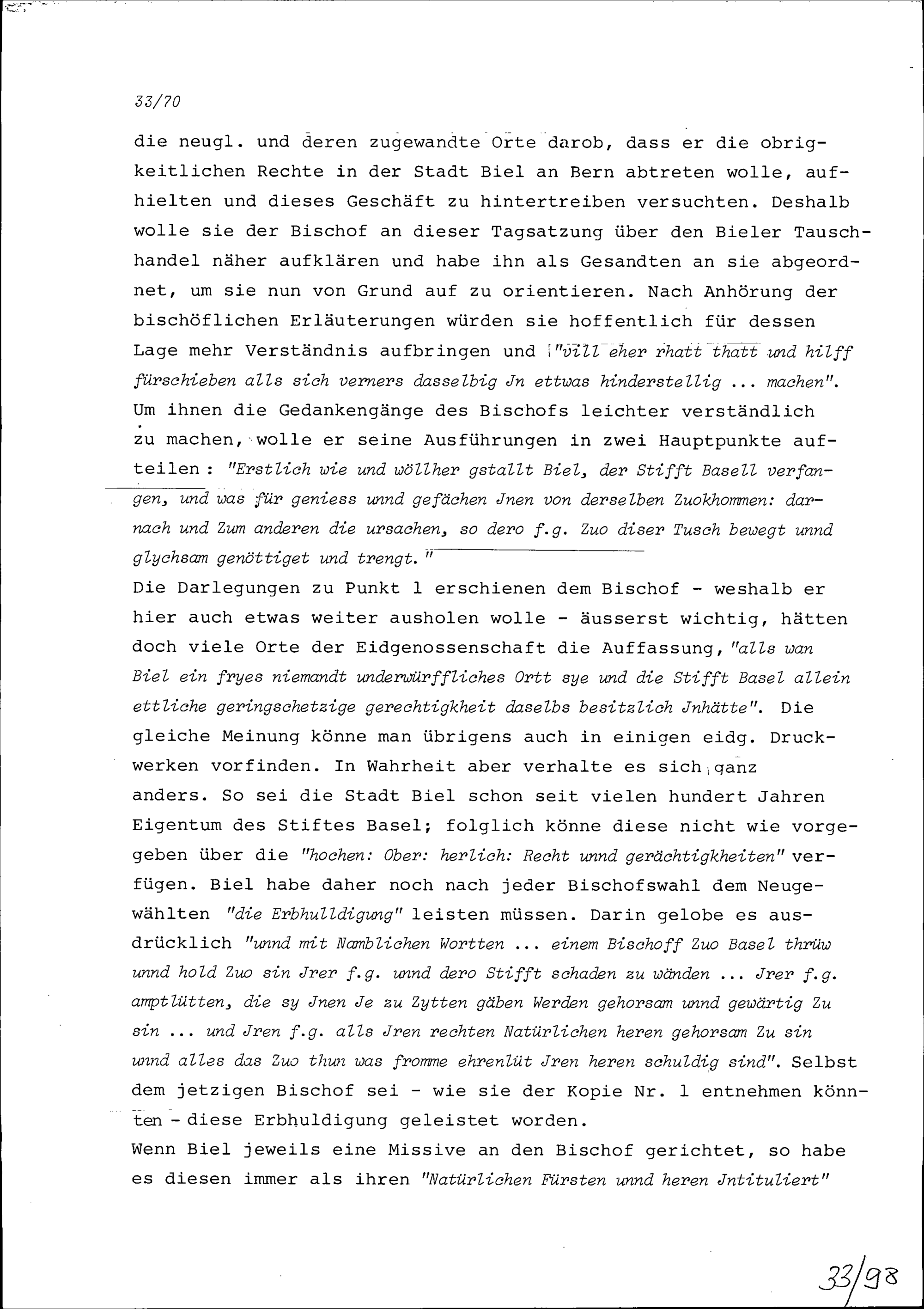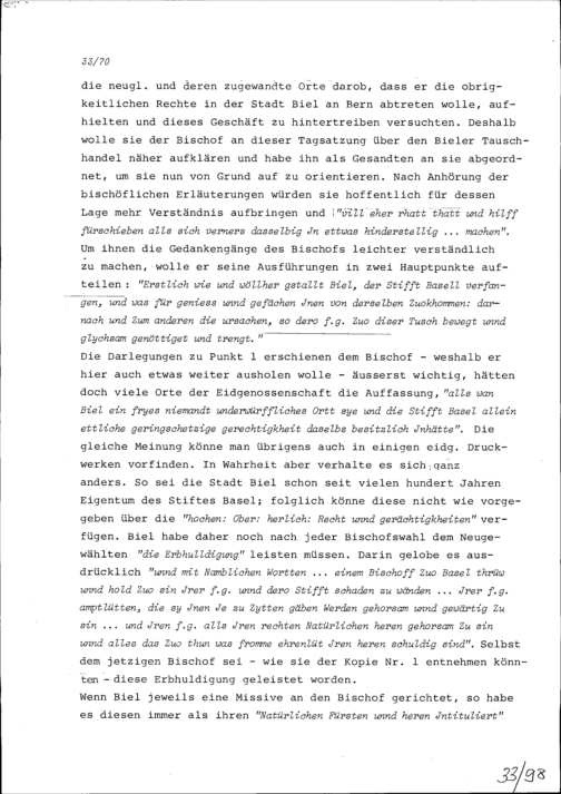 Vortrag von Hans Wilhelm Reutner, Gesandter des Bistums Basel, an der Tagsatzung der Neugläubigen Orte in Aarau wegen des Bieler Tauschhandels