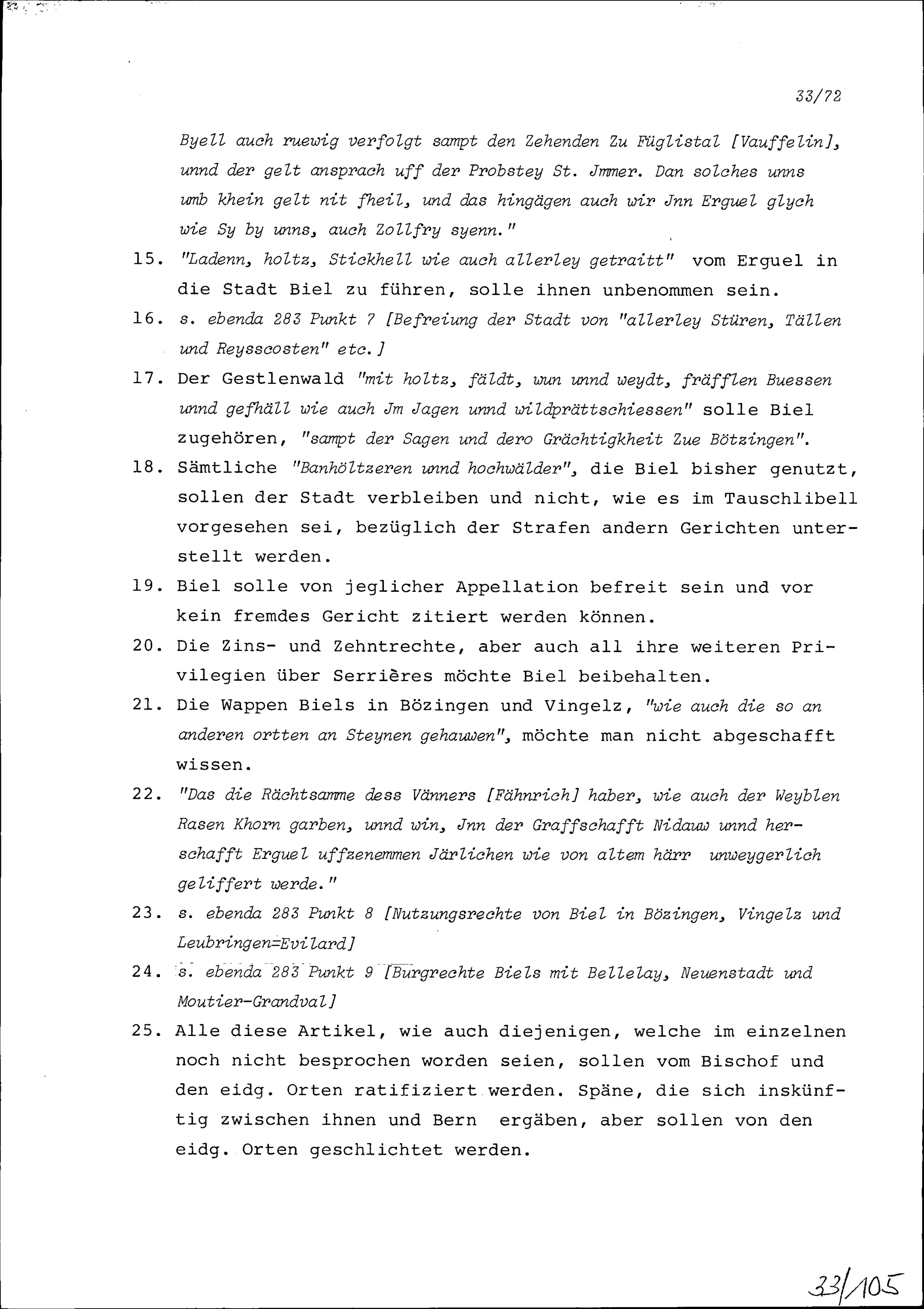Artikel der Stadt Biel, die die Stadt von Bern bestätigt wissen will, bevor sie ihre Einwilligung zum Tauschlibell gibt
