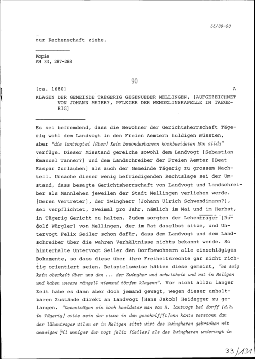 Klagen der Gemeinde Tägerig gegenüber Mellingen, aufgezeichnet von Johann Meier, Pfleger der Wendelinskapelle in Tägerig