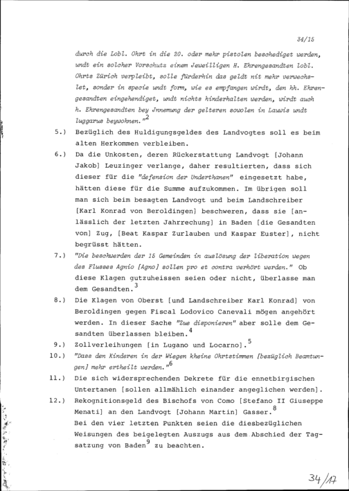 Instruktion von Stadt und Amt Zug auf die Jahrrechnung der enntebirgisch-regierenden Orte in Lugano vom 10. August 1695 und in Locarno nach dem 10. August 1695