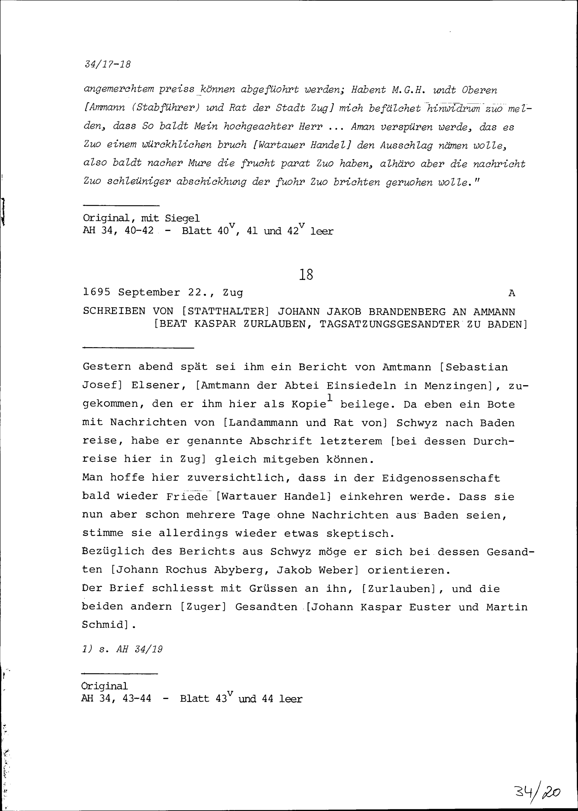 Schreiben von Johann Jakob Brandenberg, Statthalter, an Beat Kaspar Zurlauben, Ammann und Tagsatzungsgesandter zu Baden