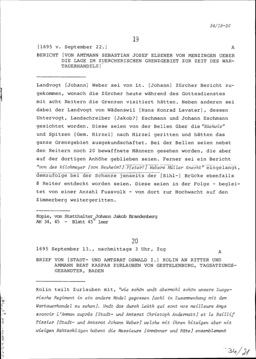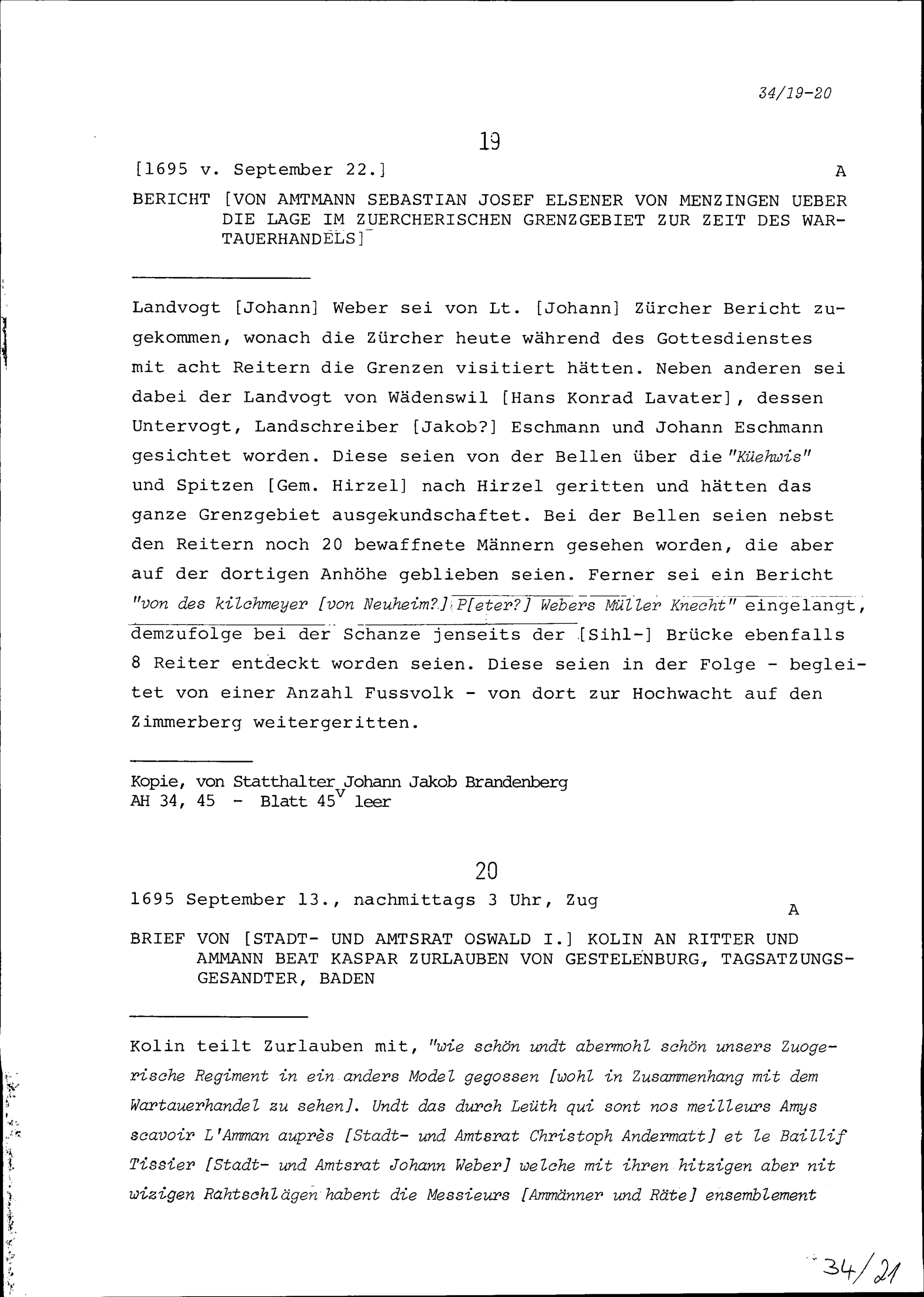 Bericht von Sebastian Josef Elsener, Amtmann, von Menzingen über die Lage im Zürcherischen Grenzgebiet zur Zeit des Wartauerhandels