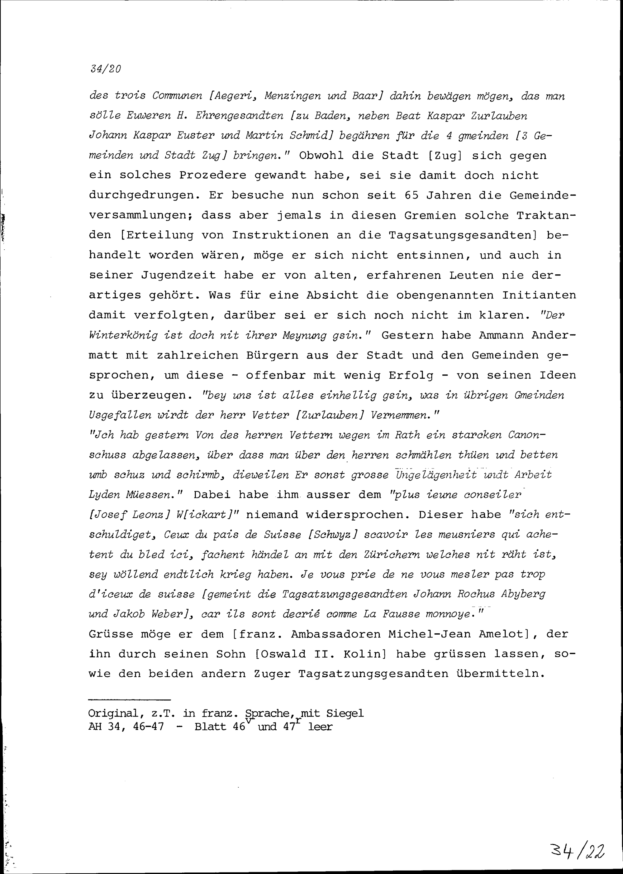 Schreiben von Oswald I. Kolin, Stadt- und Amtrat, an Beat Kaspar Zurlauben, Ammann und Tagsatzungsgesandter, Baden