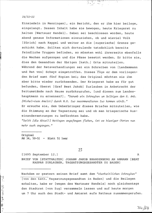 Schreiben von Johann Jakob Brandenberg, Statthalter, an Beat Kaspar Zurlauben, Ammann und Tagsatzungsgesandter in Baden
