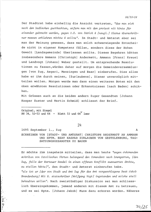 Schreiben von Christoph Andermatt, Stadt- und Amtrat, an Beat Kaspar Zurlauben, Ammann, Hauptmann und Tagsatzungsgesandter in Baden