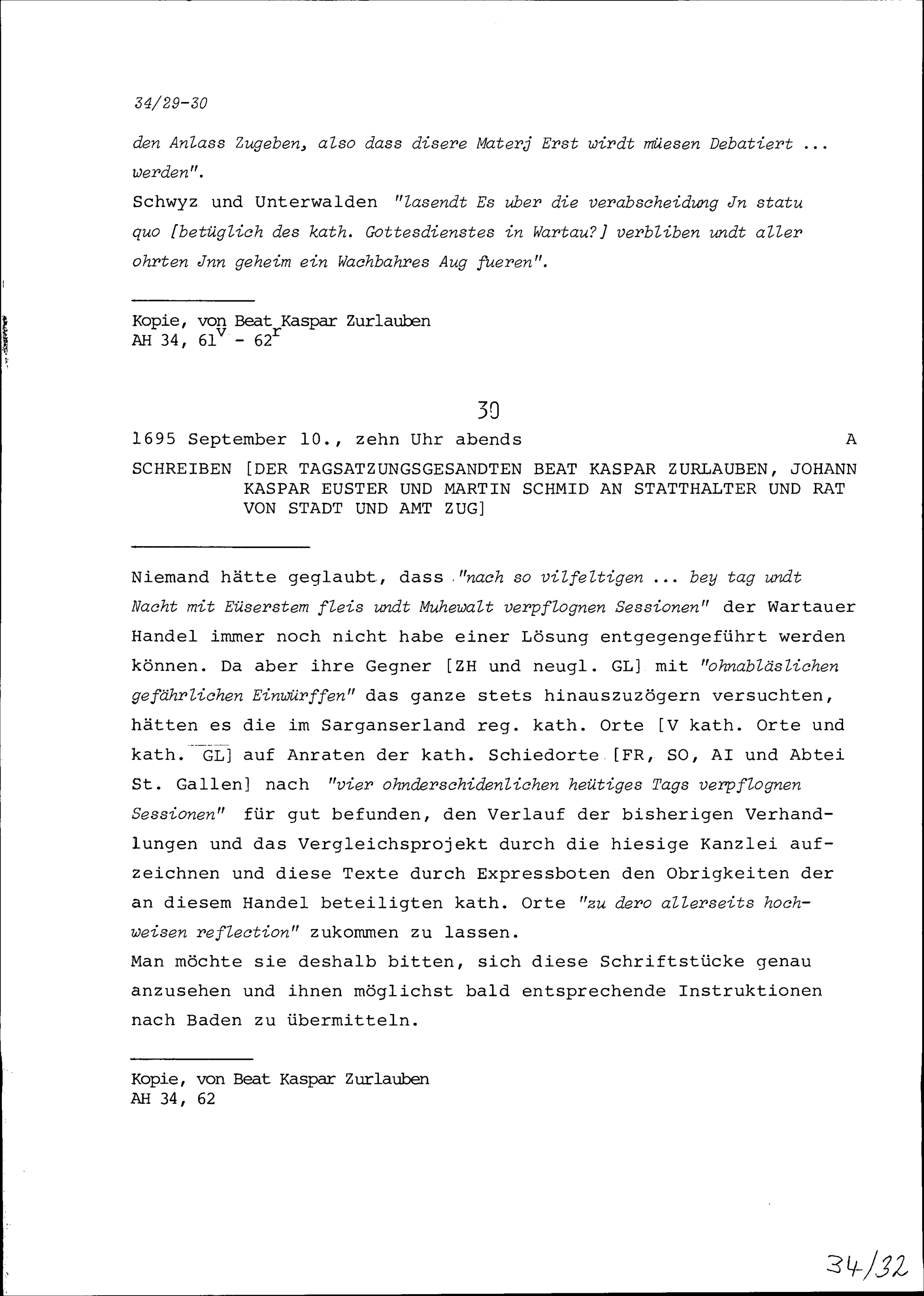 Schreiben von Beat Kaspar Zurlauben, Ammann, von Johann Kaspar Euster und von Martin Schmid, alle Tagsatzungsgesandte, an Statthalter und Rat von Stadt und Amt Zug