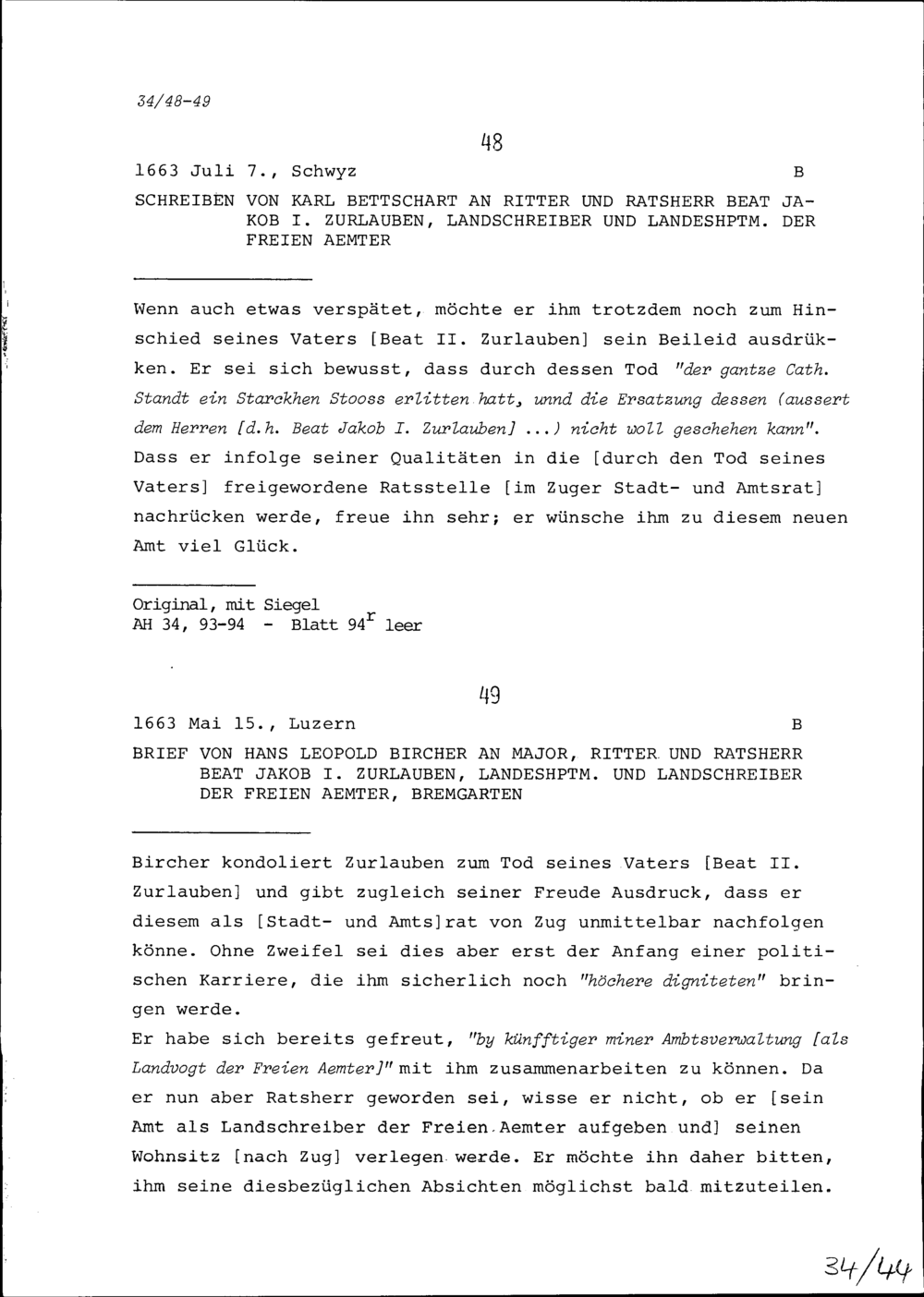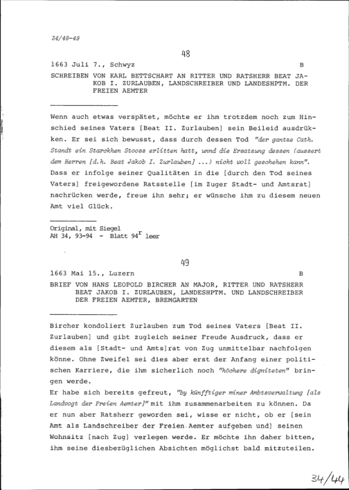 Schreiben von Karl Betschart an Beat Jakob I. Zurlauben, Ratsherr, Landschreiber und Landeshauptmann der Freien Ämter