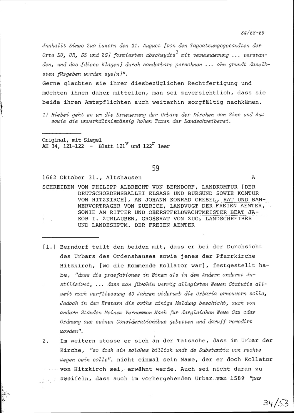 Schreiben von Philipp Albrecht von Berndorf, Landkomtur der Deutschordensballei Elsass und Burgund sowie Komtur von Hitzkirch, an Johann Konrad Grebel, Rat und Bannervortrager von Zürich, Landvogt der Freien Ämter, sowie an Beat Jakob I. Zurlauben, Oberstfeldwachtmeister, Grossrat von Zug, Landschreiber und Landeshauptmann der Freien Ämter