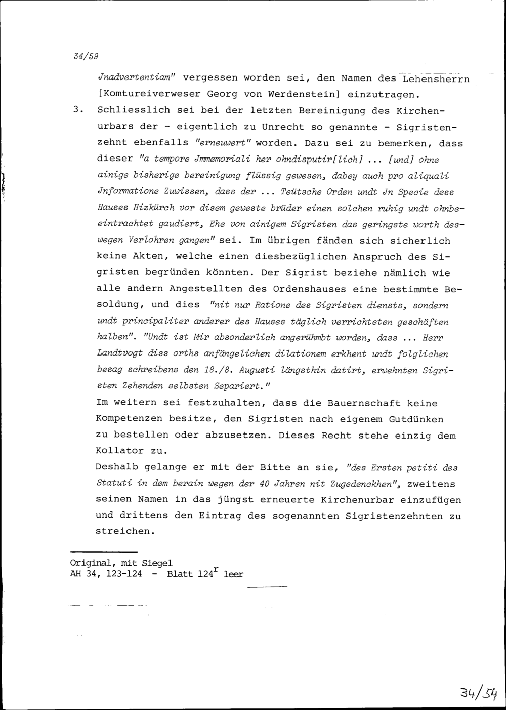 Schreiben von Philipp Albrecht von Berndorf, Landkomtur der Deutschordensballei Elsass und Burgund sowie Komtur von Hitzkirch, an Johann Konrad Grebel, Rat und Bannervortrager von Zürich, Landvogt der Freien Ämter, sowie an Beat Jakob I. Zurlauben, Oberstfeldwachtmeister, Grossrat von Zug, Landschreiber und Landeshauptmann der Freien Ämter
