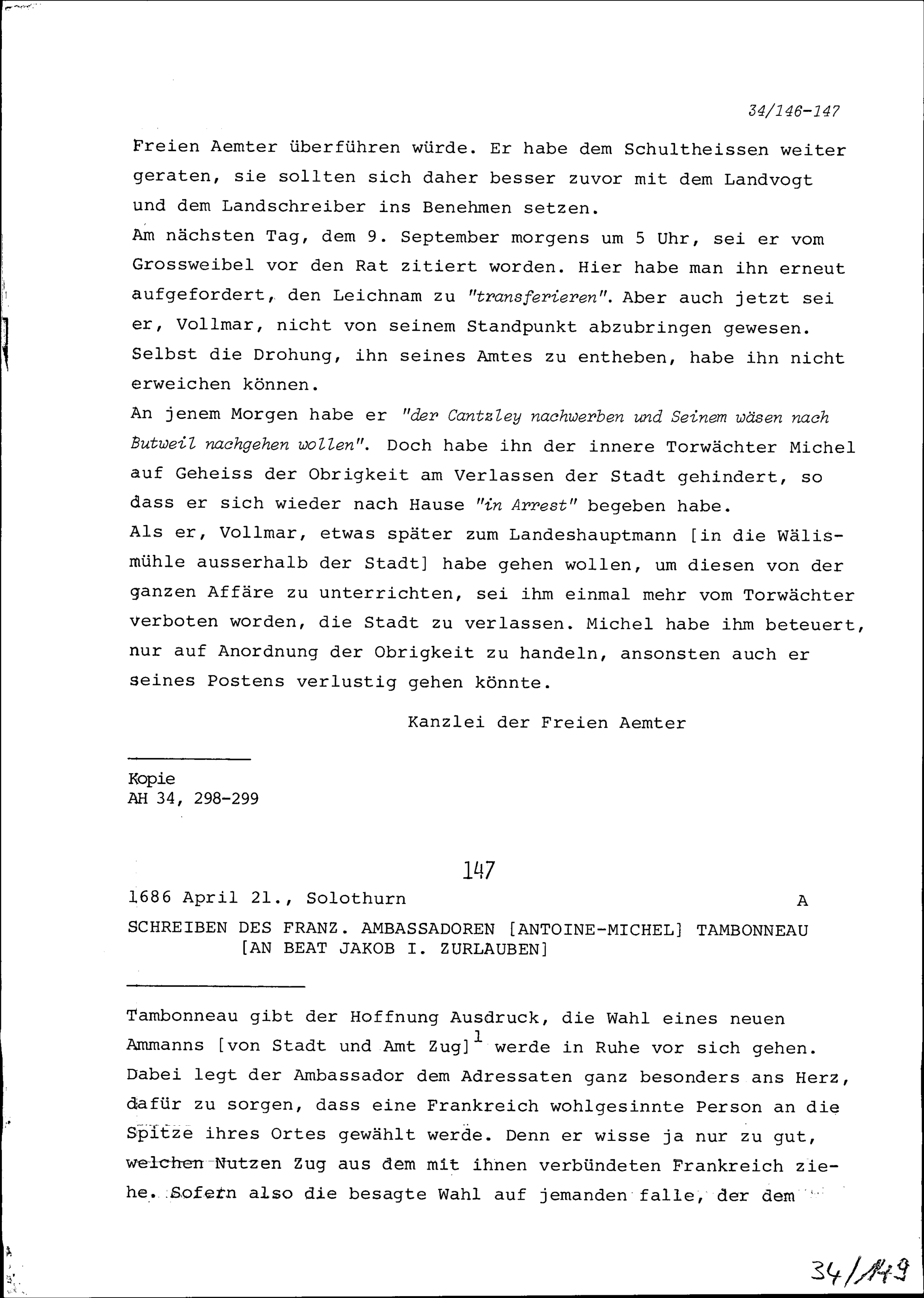 Schreiben von Antoine-Michel Tambonneau, Ambassador von Frankreich, an Beat Jakob I. Zurlauben