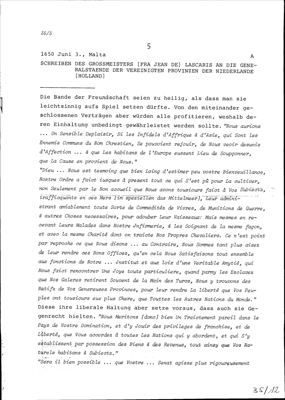 Schreiben von Jean de Lascaris, Grossmeisters des Malteserordens, an die Generalstände der vereinigten Provinzen der Niederlande