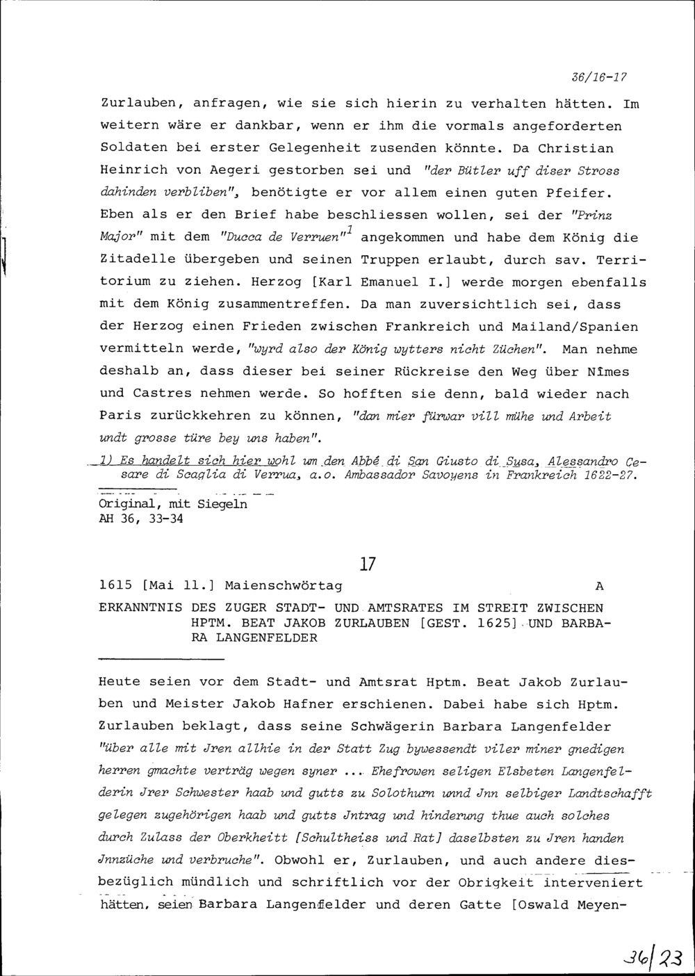 Beschluss des Stadt- und Amtrats Zug im Streit zwischen Beat Jakob Zurlauben, Hauptmann, und Barbara Langenfelder