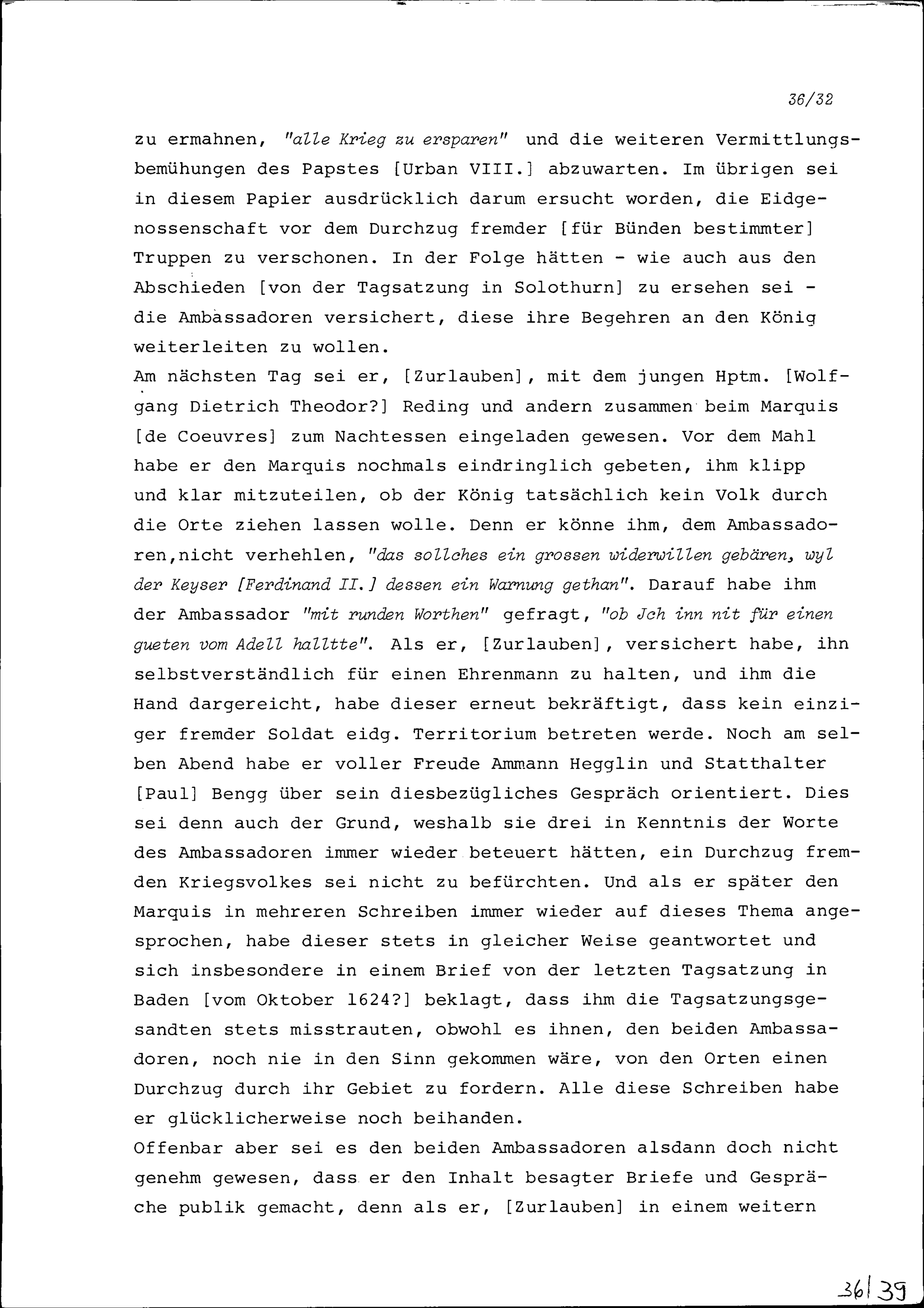 Bericht von Konrad III. Zurlauben über die Frage, ob Frankreich Truppen durch eidgenössisches Gebiet nach Bünden führen wolle