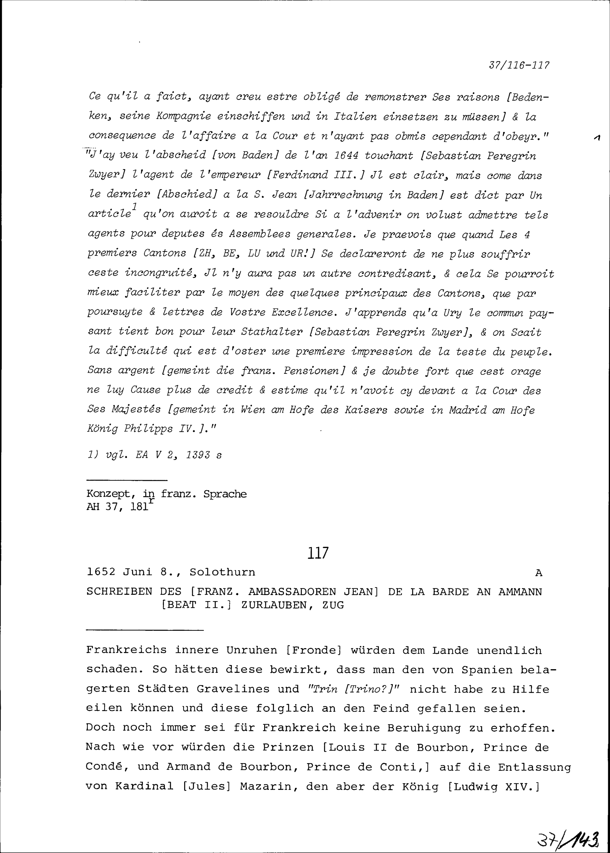 Schreiben von Jean de la Barde, Ambassador von Frankreich, an Beat II. Zurlauben,...