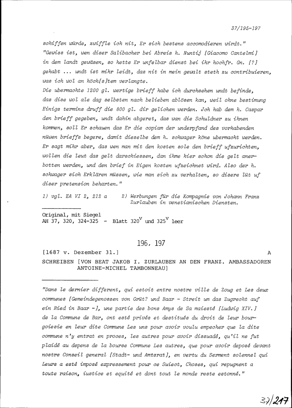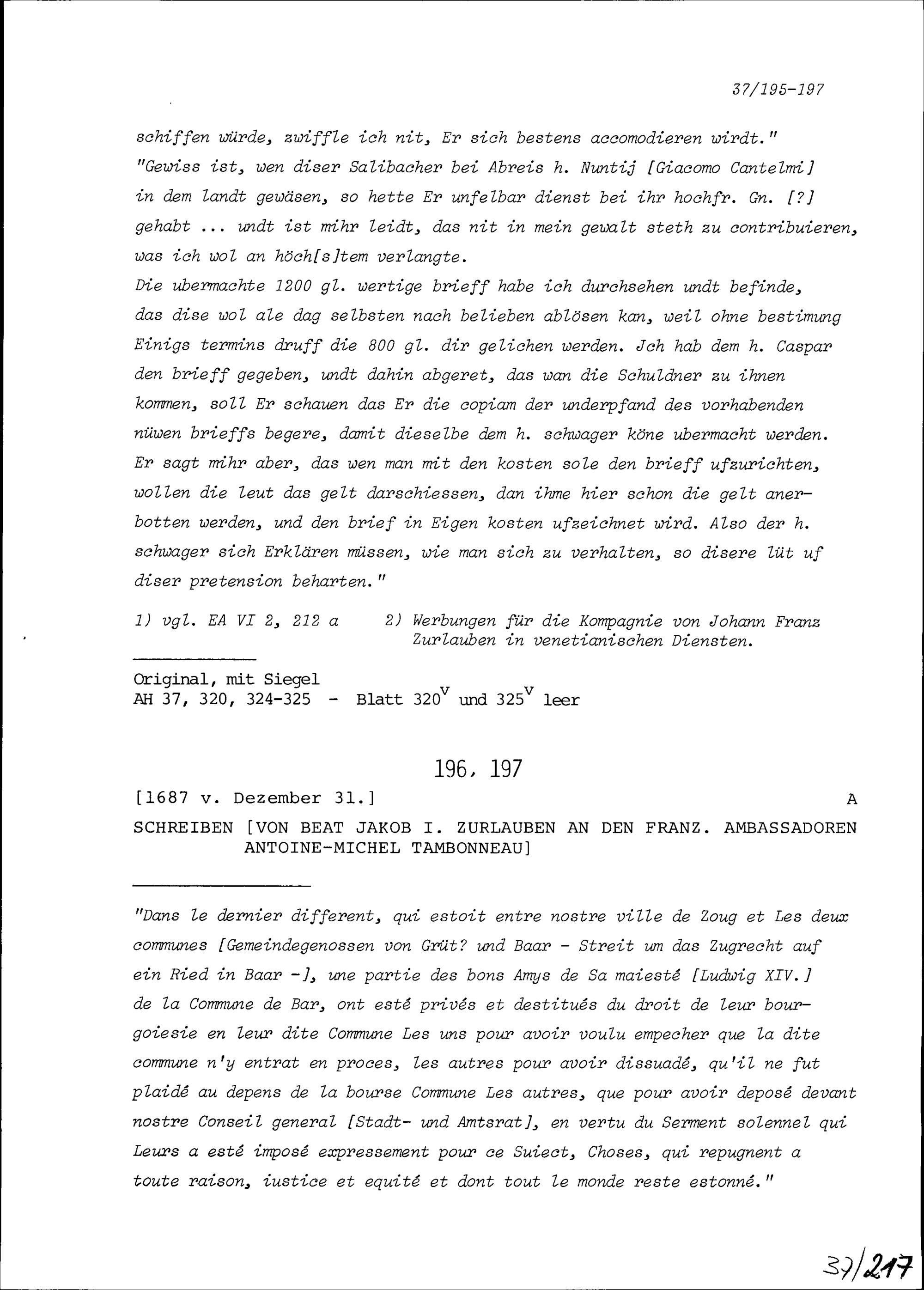 Schreiben von Beat Jakob I. Zurlauben an Antoine-Michel Tambonneau, Ambassador von Frankreich