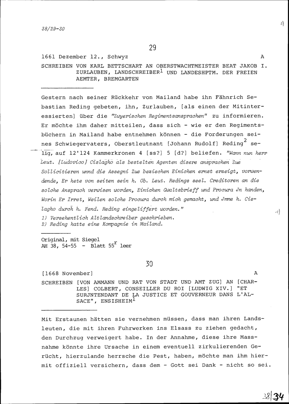 Schreiben von Karl Betschart an Beat Jakob I. Zurlauben, Oberstwachtmeister, Landschreiber und Landeshauptmann der Freien Ämter, Bremgarten