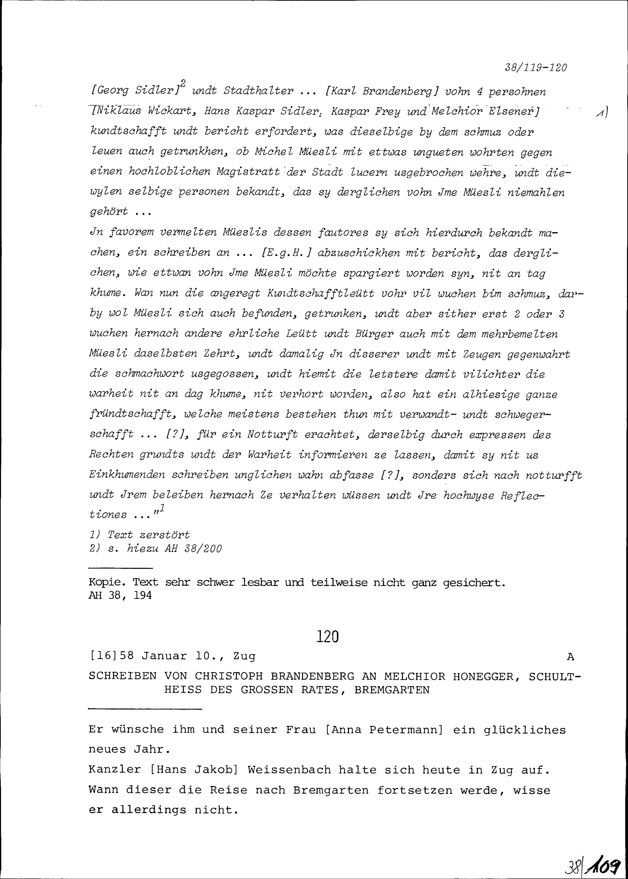 Schreiben von Christoph Brandenberg an Melchior Honegger, Schultheiss des Grossen Rats, Bremgarten